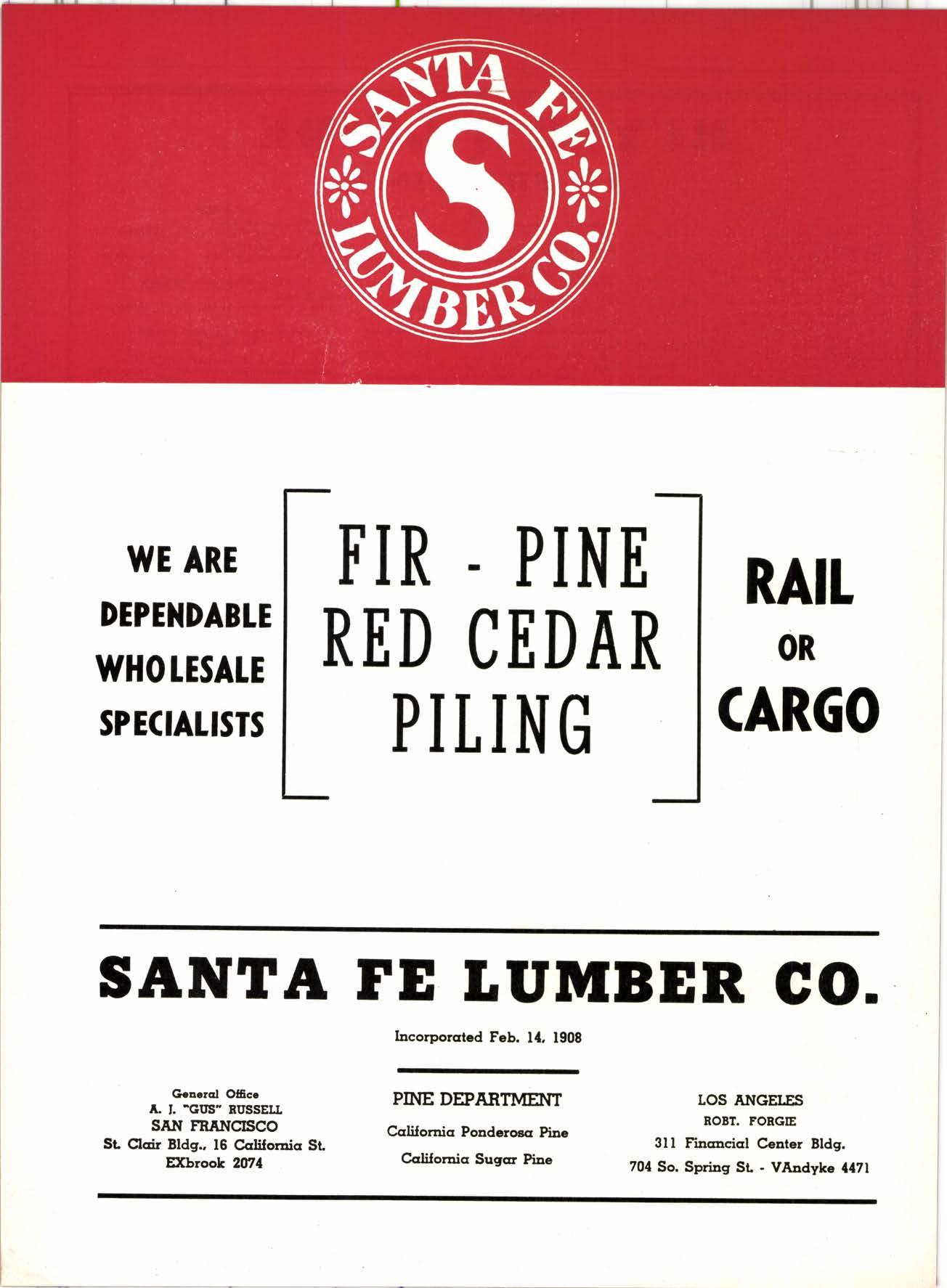 WE ARE DEPENDABTE WHOTESATE SPECIALISTS FIR PINE RED CEDAR PILING RAIt OR CARGO SANTA TE I"UDTBER GO. lncorporcrted Feb. 14, 1908 Genorcl Ol6ce A. I. 'GIIS" NUSSELI SAN FRANCISCO Sr Ocdr Bldg., 16 Ccrlilornio St. E(brook 2074 PINE DEPANTMEIVT Cclilornio Ponderosq Pine Ccrlilornio Sugcr Pine LOS ANGEI.JES NOBT, FORGIE 3ll Financicrl Center Bldg. 704 So. Spring SL - VAndyke 44Zl