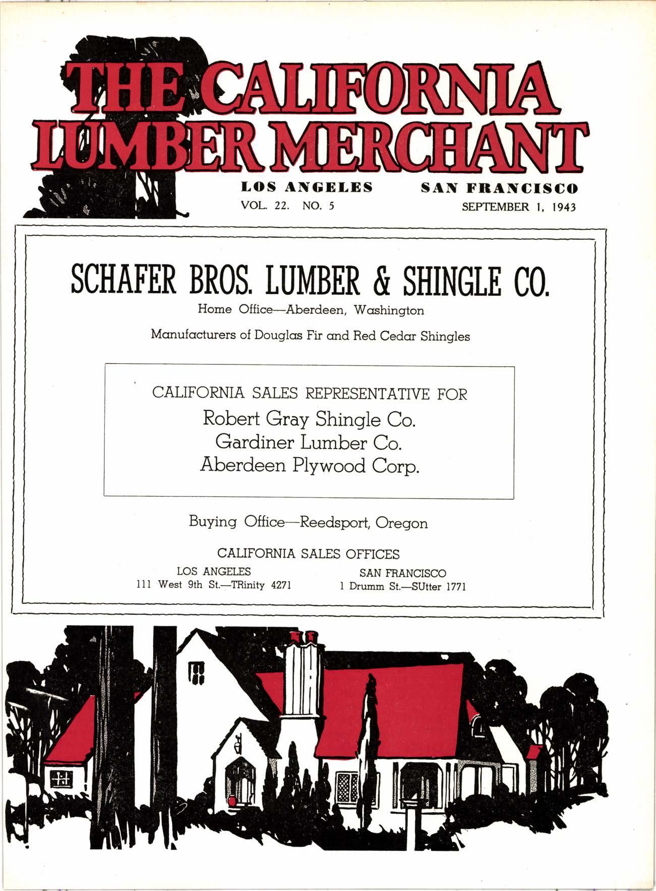 IOS ANGf,LES voL 22. NO. 5 SAN ]BANCISCO SEPTEMBER I, 1943 SCHAFER BROS. IUMBER & SHINGLE CO. Home Office-Aberdeen, Woshington Monufacturers of Douglos Fir ccnd Red Cedcn Shingles CALIFORNIA SALES REPRESENTATIVE FOR Robert Gray Shinqle Co. Gardiner Lumber Co. Aberdeen Plywood Corp. Buying Office-Reedspo4 Gegon CAUFORNIA SALES OFFICES tOS ANGELES SAN FRANCISCO lll West gth St.-TRinity 4271 I Drumm St.-SUtter l77l