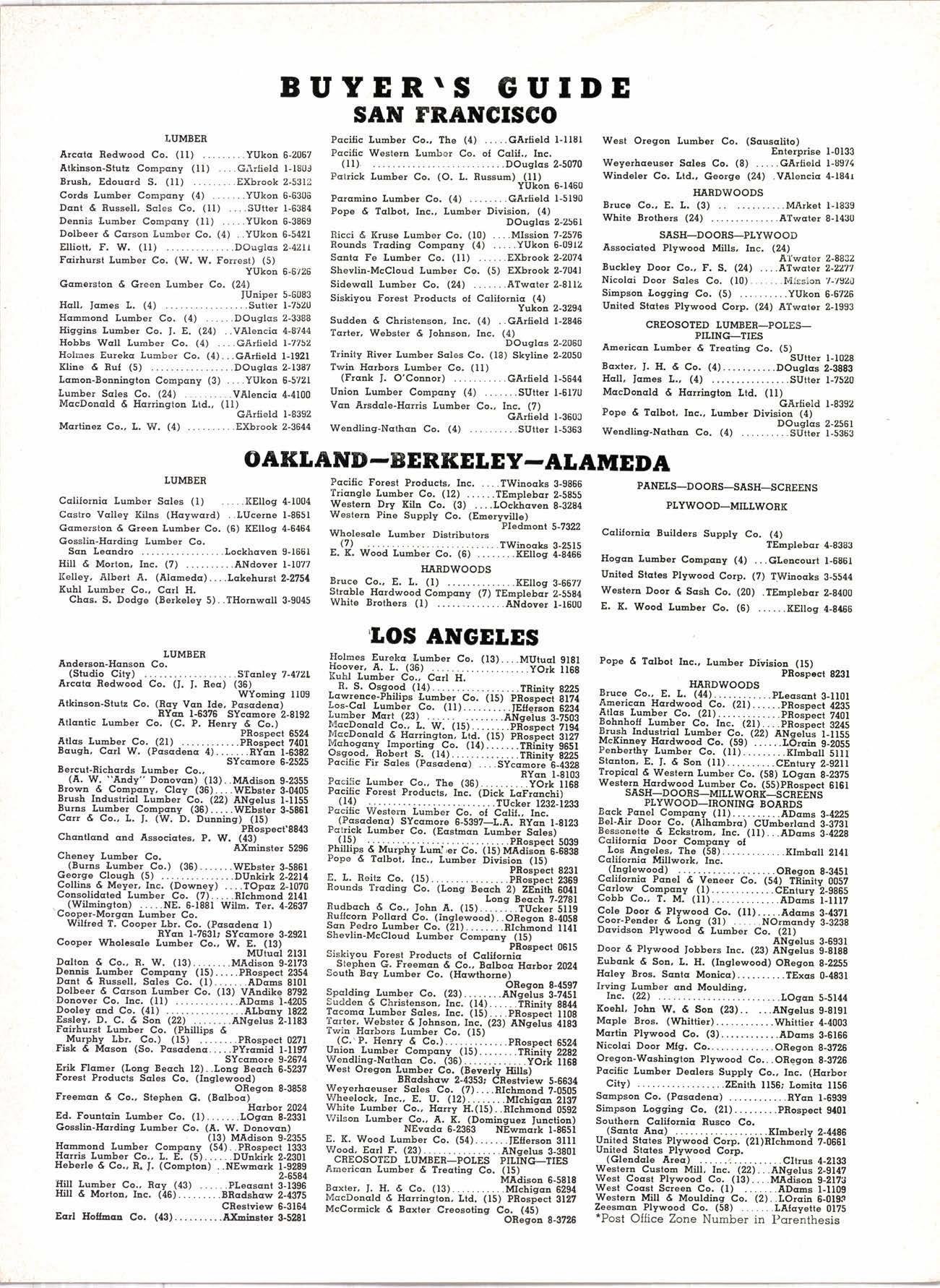Wendliug-Ncthan Co, (4) .SUtter l-5353 Co, (Sausqlito) Elterprise l-0133 Weyerboeuser ScleE Co, (8) .,...GArlield t-89?4 Wiadeler Co. Ltd., George (2{) .VAlencic 4-184r HARDWOODS Bruce Co., E. L, (3) .....MArket l-1839 White Brolhers (24) .ATwater 8-1430 SASH-DOORS_PLYWOOD Associated Plywood Mills, Inc. (24) Alwqter 2-8832 Buckley Door Co., F. S. (24) ....ATwalet2-Ztt7 Nicolci Door Sqles Co. (10).......Mlssion 7-7920 Sinpson trogging Co. (5) ..........YUkon 6-5726 United Stctes Plywood Corp, (24) ATwcter 2-1993 CNEOSOTED IUMBER-POLESPILING_TIES Americqn Lumber 6 Treciiag Co. (5) SUtter l-1028 Bcxler, l. H. d Co. (4)...........DOuglcs 2-3883 Hcll, lcnes 1., (4) .Sutt€r l-7520 MacDonqld & Hcrriagton Ltd, (ll) GArtield l-8392 Pope d Tclbot, Inc., Lumbcr Division (4) wendting-Nctbcn co. (4) . .. 3?rV,* ?:3331