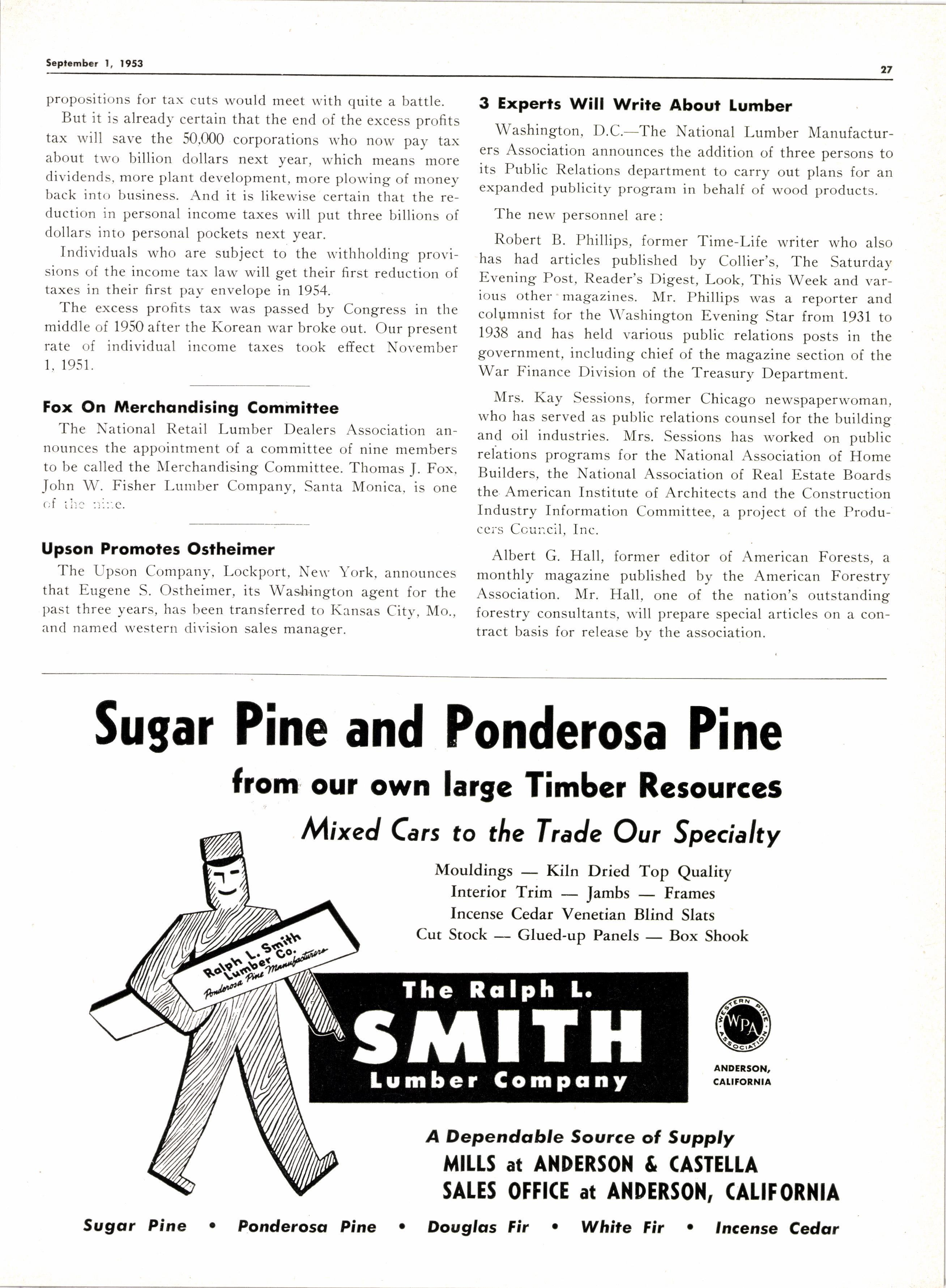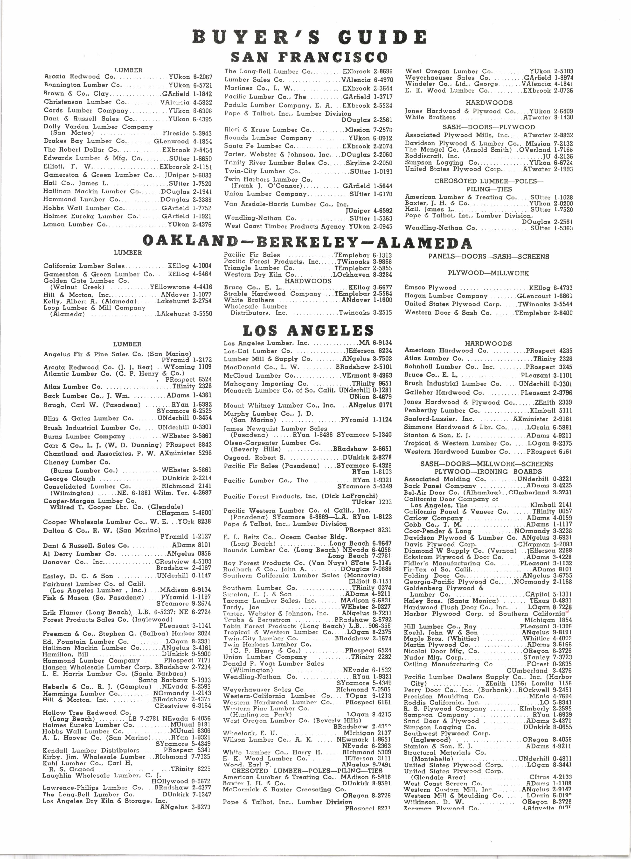 6-0912 Scntc Fe Lumber Co.. ....EXbrook 2-2074 Tcrler, Websler 6 lohnson, Inc,...DOuglcs 2-2060 Trinity River Lumber Sales Co......Skyline 2-2050 Twiu-City Lumber Co. ..SUtter l-019I Twin Hqrbors Lumber Co. (Frcak !, O'Couor) GArlield I-5644 Union Lumber Compcuy. ...SUttsr l-6170 Vcn Arsdqle-Hcrris Lumber Co., Iuc, lUniper 4-6592 Wendliag-NcthcD Co. ....SUitrr l-5363 West Coast Timber Products Ageacy.YIJkoa 2-0945 West Oregon Lumber Co.. YUkon 2-5103 Weyerhceuser Scles Co. .........GArficld l-8974 Windeler Co., Ltd., George ......VAlencic 4-18{i E. K. Wood Lumber Co.... .......EXbrook 2-0736 IIANDWOODS Jones Hcrdwood 6 Plvwood Co.....YUkon 2-6{09 White Brotbers . .ATwqter 8-1430 Associsted Pllryood Mills, Inc,....ATwcter 2-8832 Davidson Plywood d Lumber Co...Mlssiou 7-2132 The Mergel Co, (Amold Smith)..OVerlcnd l-7166 Roddiscrclt, Inc. ..IU 4-2136 Simpson Logging Co...... .YUkou 6-6724 Uuitod Siatea Plywood Corp,......ATwcter 2-1993 CREOSOTED LIIMBEN_POLES_ PILING_TIES Americco Lumber 6 TroqtiEq Co.....SUtrer l-1028 Bcxter, t. H. 6 Co.................. .yUkor 2-0200 Hcll, Jqnee L........ SUtter l-7520 Pope 6 Tclbot, Iuc., Lumber Division, DOuglcs 2-2561 Weudling-Nctha! Co. .. . SUiler l-5363 PANELS_D OORS_SASH_SCNEENS PLYWOOD_MILLWONK Emsco Plywood ..KEllog 6-{733 Hogan Lumber Compcoy ........Gleacourt l-6861 United Stdles Plywood Corp. ....TWinocks 3-554{ Weslen Door 6 Scsh Co. .TEmplebcr 2-8{00 ITARDWOODS Americcn Hqrdwood Co. ..........PBospect {235 Atlas Lumber Co. ......lBiaity 2325 Bohahofl Lumber Co., Inc. ........PBospect 32{5 Btuco Co., E. L. ......Pleascnt 3-ll0l Brush Industriql Lumber Co, ....UNderhill 0-3901 Gqlleher Hqrdwood Co. ..........Plecscnt 2-3796 Jones Hcrdwood d Plywood Co.......ZEnith 2339 Perberthy Lumber Co. .....Klmball 5lll Solord-Lussier, Iuc. ........AXmiuister 2-9181 Simnons Hcrdwood 6 Lbr. Co,..... .LOrcin 6-588I Stcnton d Soa, E. J. .....ADans 4-9211 Troi:iccl 6 Woslorl Lumber Co. ....LOgcn 8-2375 Weslerr Hcrdwood Lubs Co. ....PRospect 616l WONK_SCREENS PLYWOOD_IRONING BOANDS