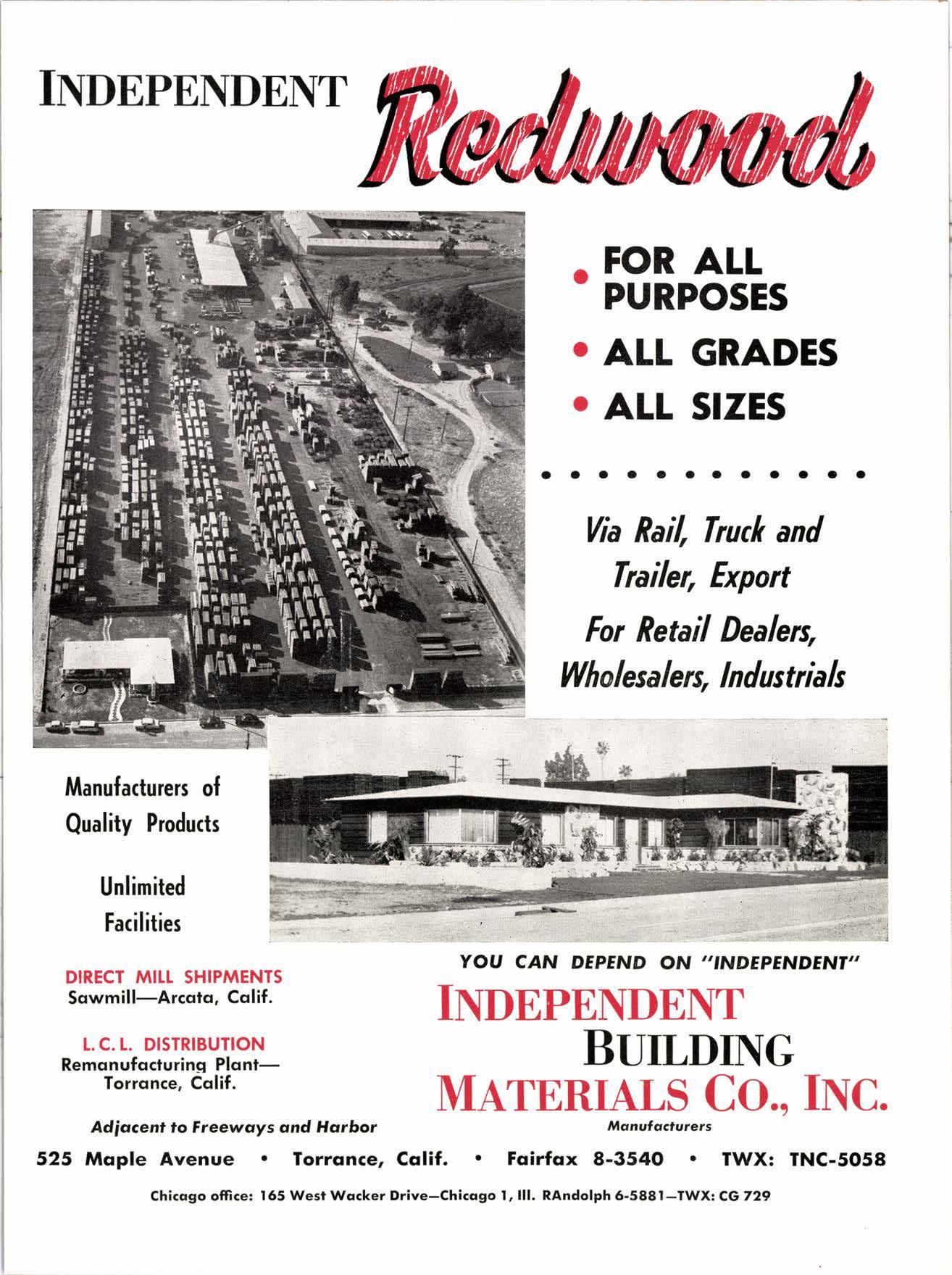 INDtrPEI\DEI\T o FOR ALL PURPOSES O ALL GRADES o ALt SIZES ooaaoaaaaaaa Via Rail, Truck and frailer, Export For Retail Dealers, Wholesalerc, lnd ustrials Manufacturers of Quality Products Unlimited Facilities YOU CAN DEPEND ON "'NDEPENDENT" DIRECT MIt[ SHIPMENTS Sqwmill-Arcqlo, Cqlif. t. c. r. DrsTRrBUTloN Remqnufqcturing PlqnrTorrtrnce, Colif. Adiacent lo Freewsys and Hsrbor 525 Mople Avenue . Torronce, Colif. . Foirfqx 8-3540 . TWX: TNC-5O58 II\DEPEl\DEi\T MettrRIALS CO., II\C. lllqnulacturers BT]ILDING Chicogo ofrice: | 65 West Wqcker Drive-Chicago f , lll. RAndolph 6-588 | -TWXt CG 729