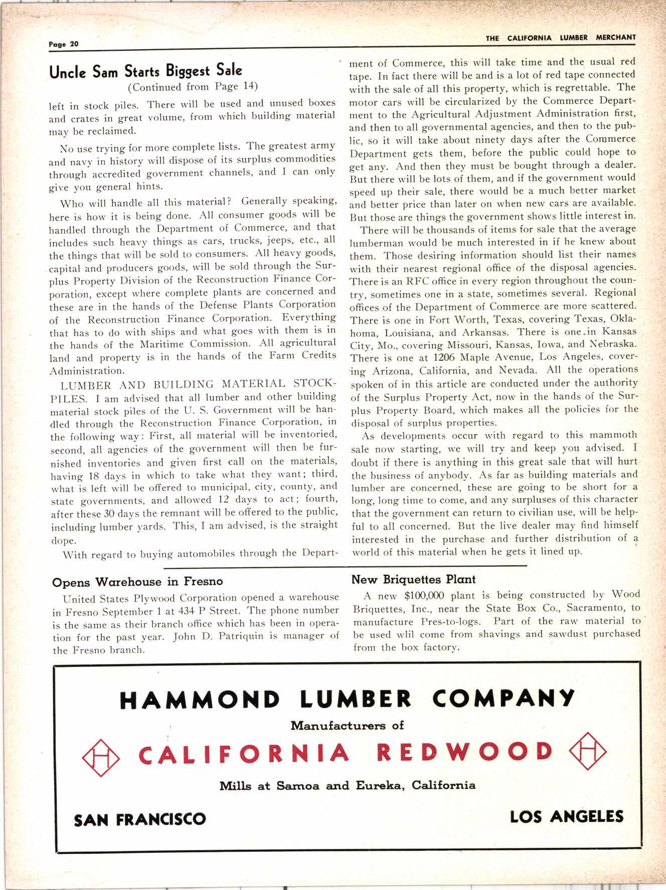 Looking back, it is hard to believe thct such c gigcrntic tcrsk wcs crccomplished in such <r compcrcrtively short period oI time. In looking checd, we have cr seemingly insurmountcble iob still to complete. Much that has been laid wcste must be restored. our occupcrtionql lorces must be provided lor. Permcrnent militcry instcllctions must be erected qnd mqintcined crs bcstions oI c lcrsting peace. This crll plcrces cr continutngly hecrvy demcnd on our output oI quclity Redwood. Therelore, ct lecst lor the next Iew months our position in being able to supply your needs, remcins unchcnged.