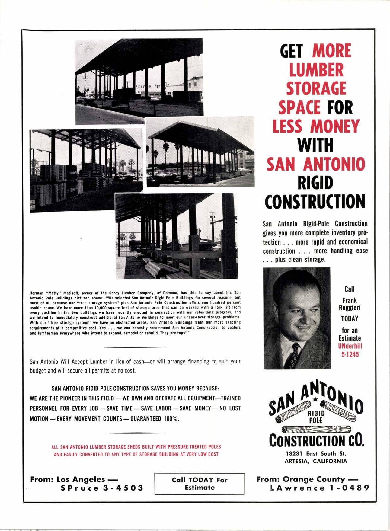 Herman "ilatty" Matisofi, ownor 0f the Garey Lunber Company, of Pomona, has this to say about his San Antonio Pole Building3 pictured above: "We selected San Antonio Rigid Pole Buildings tor several reasons, but most of all because our ,,trse storage ststem" plus San Antonio Pole Construction offers one hundred percent usable space, Ws haye morc than 10,000 square teet ot storage area that can be worked with a lork lift trom eyery position in the two luilding3 we have recently eaected in cotrnection with our rebuilding program, and we intend to immediately construct additlonal San Antonio Buildings to meet our under-cover st0rage problems. with our ,,ttee storage system" we have no obstructed areas. san Antonio Buildings meet our most exacting requirements at a competitive coit, Yas , we can honestly recommend San Ant0nio Construction to dealers and lrmbermen svertuhere who intend to expand, remodel or rebuild. They are tops!"