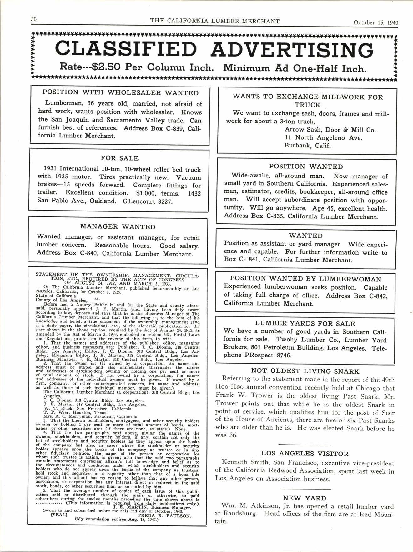 ut lhe Uatrtomia Lumber Merchlrnt, published Semi-monthly st Log {:nseles, California, for October l, 1939. Statc of Califomie' County od Los Ansctcs. lt.