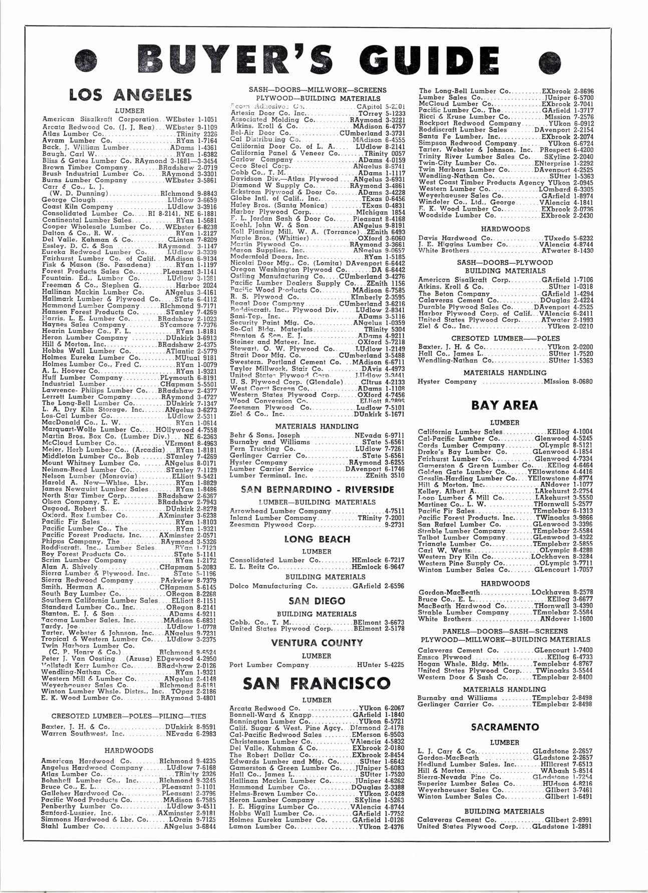 Lumber. ..ADqms l-4361 8augb,CcrlW....... ........RYcn l-6382 Bliss G Gctes Lumber Co. RAymond 3-1681-3-3454 Brown Timber Compcny.........BRcdshcw 2-0719 Brush Industricl Lumber Co.... .BAymoad 3-3301 Burns .Lumber Compcny .WEbster 3-5861 Essley, D. C. d Son ...RAymond. 3-1147 Eurekq Redwood Lumber Co...... LUdlow 3-3339 Fqirhursl Lumber Co, oI Cclil...MAdison 6-9134 Fisk 6 Mcon (So. Pcsqdenq) ......RYon l-llg7 Forest Producis Sqles Co.... .Pleqscnt 3-l14l Fountqin, Ed., Lumbcr Co..... .LUdlow 3-1381 Freemcn d Co., Stephen G,..... ....Harbot 2024 Hcllinon Mcckin Lumber Co. ANgelus 3-4161 Hqllmqrk Lumber 6 Plvwood Co.....STqte 6-4112 Hqmmond Lunber Compqnv......Blchmond 9-717I Hqusen Forest ProductJ Co, .STcnlev 7-4269 Horris, L. E. Lumber Co.........Bncdshd; 2-lm3 Hcynes Scles Compcny. ..... .SYccmore 7-7378 Heqrin Lumber Co., F. L, ...RYcn l-8181 Heron Lumber Compcny .DUakirk 3-6913 Hill 6 Morton, Inc.. .BRqdshaw 2-4375 Hobbs Wcll Lumber Co.. .ATldntic 2-5779 Holmes Eurekc Lumber Co...........MUtucl 9l8l Holmes lumber Co., Fred C.. .BYan l-0079 A. L. Hoover Co.. ....RYcn l-9321 HuII Lunber Compcnv. .Plvmouth 6-8191 Industricl Lumber................CHcpmqn 5-5501 Lqwence- Philips Lumber Co....BBcdihcw 2-43?7 Lerrelt Lumber Compcny. .RAymond 3-4727 Tbe Long-Bell Lumber Co..........DUnkirk 7-1347 L. A. Dry Kilu Storoge, Inc.......ANgelus 3-6273 Los-Ccl Lumber Co...... ..LUdlow 2-5311 MccDoncld Co., L. W.. ......RYqn l-0614 Mcrquclt-Wolle Lumber Co.. .HOllywood 4-7558 Msrtin Bros, Box Co. (Lumber Div.). .NE 6-2353 McCloud Lumber Co.. ....VErmont 8-4963 Meier, Hsrb Lumber Co., (Arcodic). .RYcn I-8181 Middleton Lumber Co., Bob .......STcnlev 7-4269 Mount Whitney Lumber Co. ......ANgetu; 8-017I Neimcn-Reed Lumber Co...........STcalev 7-1129 Nelson Lumber (Monrovic) .......Eltioti 9-5421 Hqrold A, New-Whlse. Lbr.........BYcn l-8829 Iqmes Newquisl Lumber Sales........RYcn l-8d86 North Stqr Timber Corp......... .BRcdshcw 2-6367 Olsen Compcny. T. E. .....BBcdshaw 2-7943 Osgood, Robert S.. .......DUnkirk 2-8278 Oxlord, Bex Lumber Co..........AXminster 3-6238 Pccilic Fir Sales... .RYcn l-8103 Pocific Lumber Co., ?he. ....RYcn 1-9321 Pccific Foresl Producls. Inc......AXminster 2-0571 Phipps Compcny. The.. .BAvmond 3-5326 Roddiscrclt, Inc., Lumber Sales.. .RYcn l-7t23 Roy Forest Products Co...... ...STate 5-ll4l Scrin Lumber Compcny ....RYcn l-2172 Alqu A. Shivelv .........CHcpmqu 5-2083 Sierrc Lumber d Ptvwood, Inc....... STate 5-1196 Sierrc Bedwood Cmpqny. .PArkview 8-7379 Snith, Hermcu 4.................CHcpmcn 5-6145 South Bcy Lumber Co.. ...OReqon 8-2268 Southern Cslilornic Lumber Scles....Eltiott 8-l15l Stqndard Lumber Co., Inc..........ORegon 8-2141 Sldnton, E, I. d Son. ......ADams 4-921I Tccomc Lumber Scles, Inc.........MAdison 6-6831 Tcrdy, loe. .......LUdlow l-0778 Tqrler, Webster E tohnson. Inc....ANqelus 9-7231 Tropiccl 6 Westen Lumber Co,....LUdlow 3-2375 Twin Hcrbots Lumber Co. (C. P. Henrv d Co.)........ Rlchmond 9-4524 Peter |. Vcn Oosting...(Azusc) EDgewood d-2950 !'ollsledt Kerr Lumber Co........BRadshcw 2-0126