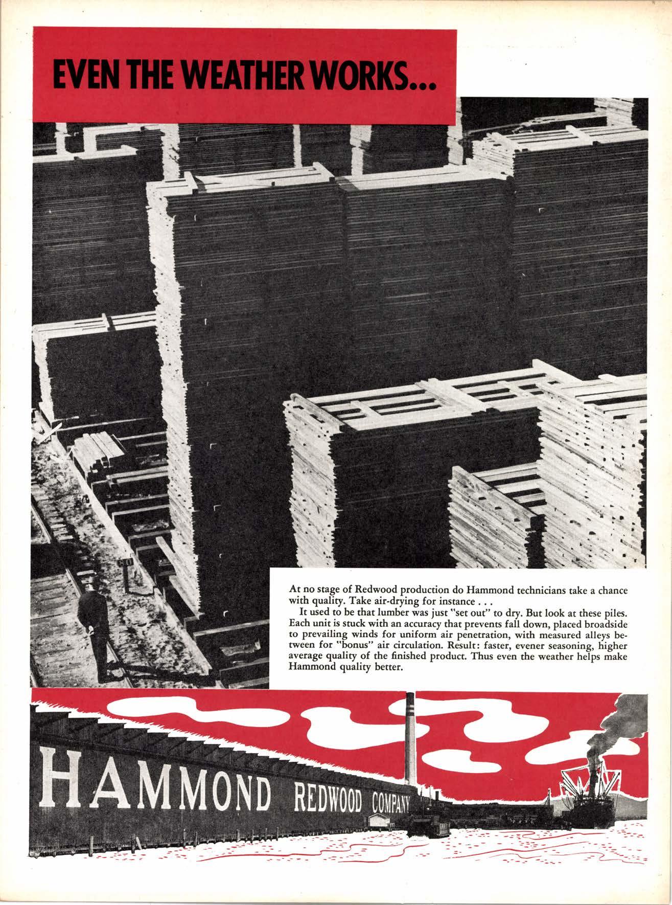 It used to be that lumber was just "set out" to dry. But look at these piles. Each unit is stuck with an accuracy that prevens fail down. placed broaiside to prev-ailing winds for uniform'air pe^netration, with meisured alleys between for "bonus" ah circulation. Result: faster, evener seasoning, liigher auenge quality of the finished product Thus even the weather helps make Hammond quality better.
