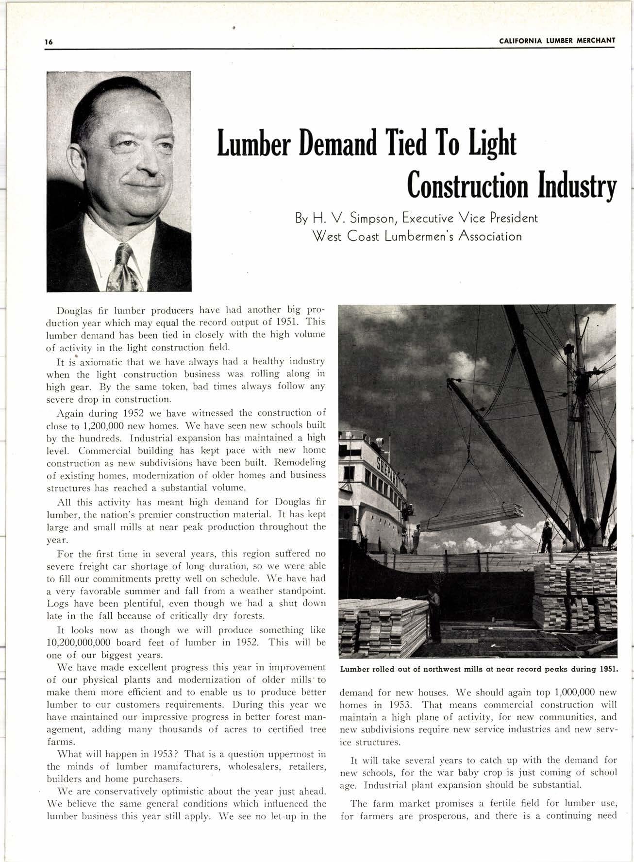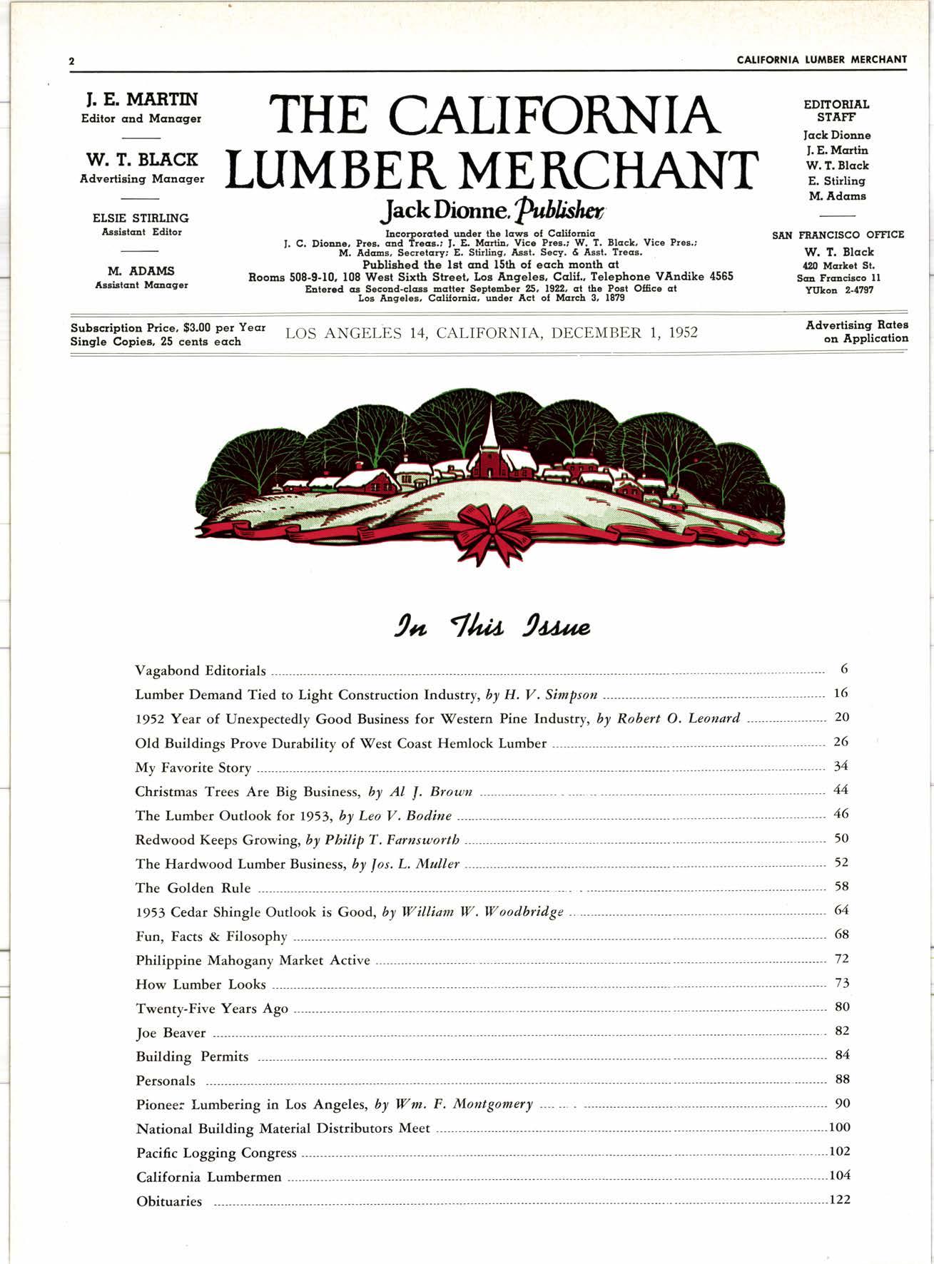 la Tltit laup Lumber Demand Tied to Light Consuuction Industryr by H, V. Simpson ......-.. 16 1952 Year of Unexpectedly Good Business for \UTestetn Pine Industry, by Robert O, Leonard. ---"..-..--....--.---- 20 Old Buildings Prove Durability of rilfest Coast Hemlock Lumber ------ - 26 Chtistmas Trees Are Big Business, by AI l, Brottn ..... -- 44 The Lumber Outlook for 1953, by Leo V. Bodine ---- -------- 46 Redwood Keeps Growing, by Pbilip T. Fmnsuortb ---.-...---.. -- -. -------- 50 The Hardwood Lumber Business, by los. L, Muller ...----------- 52 |953CedatShingleoutlookisGood,bywilliam|Y,,|ilood'bridge.. Pionee: Lumbering in Los Angeles, by lYn. F. Montgomery ----:-. . -----------... ---------- 90 National Building Material Distributots Meet .---------- -----------1OO EDITOiltrL STtrFP IaclcDioaae I.E.M.trth W.T.BlccL E. Stirling M. trdcmr Sf,T{ FRANCISCO OETTCE W. T. Blacl lfll Mcrlet St. Scn Frocieco ll YItLon 2-{?9il Advertising Bctes on Applicclion