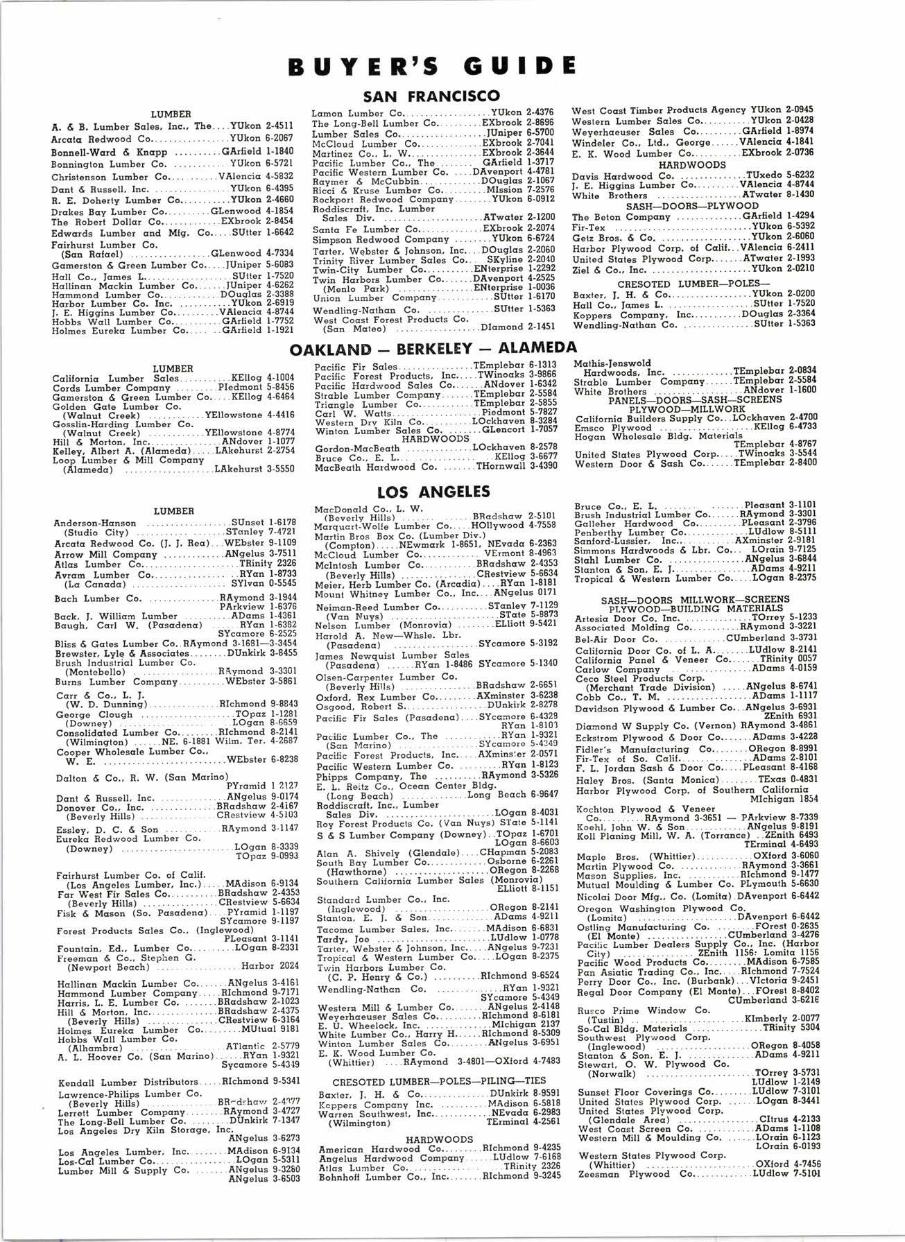 Lqmon Lumber Co...... ...YUkon 2-t1376 The Long-Bell Lumber Co.. ........EXbrook 2-8596 Lunber Sqles Co...... ....JUaiper 6'5700 McCloud Lumber Co'. ...EXbrook 2-7041 Msriinez Co.. L, W.. '.EXbrook 2'36t14 Pacilic Lumber Co,, The. .GArlield l-3717 Pacilic Wegtern Lumber Co. ....DAvenport 4-4781 Rcymer d McCubbiu. ...DOuglcs 2-1067 Ricci 6 Kruse Lumber Co..........Mlssion 7-2576 Eockporl Redwood Compouy........YUkon 6-0912 Boddiscrcli, Inc. Lumber Scles Div. ..ATwcter 2-1200 Scntc Fe Lumber Co.. ...EXbrook2'2074 Simpson Redwood Compcny '..YUkou 6-672{ Tcrter, Wgbsler { tohnson, Inc....D-Ouglas 2-2060 Trinitv niver Lumber Scleg Co'. Sf,vline 2-2Q4Q Twia-City Lumber Co... .ENterpile l-Zz-gz Twir Hcibors Lumber Co... ..DAvenpori 4-2525 (Menlo Pcrk) .......ENterpris" l-9919 Unio Lumber' Compcuy ..SUtter l-6170 Wendling-Nctbon Co. .SUtter I-5363 West Coqst Forest Producls Co. "tSi" -t"t"t".l .........Dlqmond 2-l{51 LUMBEB Cqlitornic Lumber Strles. .KEUog 4-1004 Cords Lumber Compcny .........Pledmont 5-8456 Gqmerslou