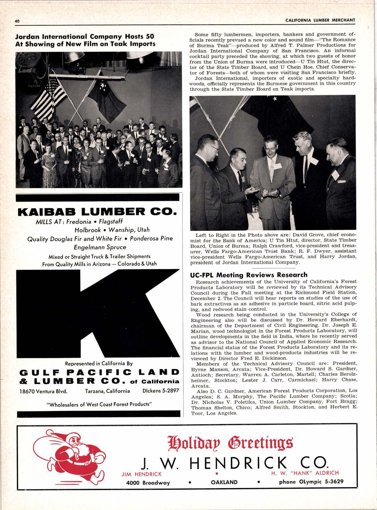 National Forest Products Week became official in San Francisco when Mayor George Christopher (left) presented his Proclamation to C. Russell Johnson, president of Union Lumber Company and current president of the California Redwood Association, who is also a third-generation lumberman and trustee of American Forest Products Industries, lnc. The Proclamation is mounted on a section from an 1100-year old redwood tree harvested from a Redwood Resion Tree Farm. and the Dro,-mo- tion was inspired tiy San Francisco Hoo-Hoo Club 9. For other western cele. brations of the first annual National Forest Products Week, see the Table of Contents below