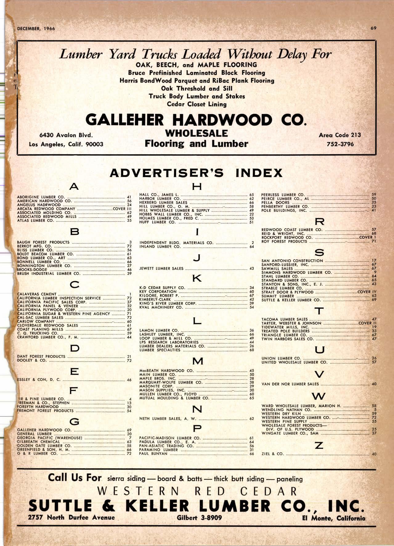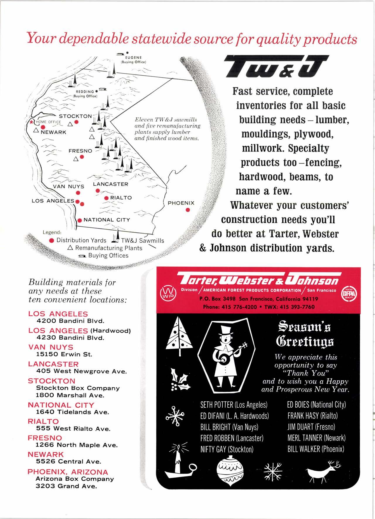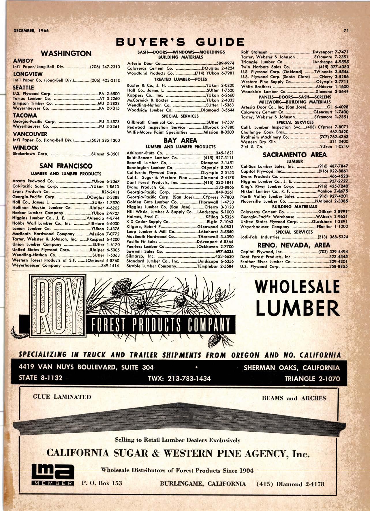 Holl Co., Jomes L. -....--SUtter l-7520 Koppers Co., Inc. ------KJkon 6-2660 lvlcCormick & Borler --.YUkon 2-4033 Wendling-Nothon Co. -----.---.-..-.....--SUtter l-5353 Woodsidc [umber Co. .-.-.-------------Dlomond 3-5644 SPECIAI SENVICES Gilbreoth Chemicol Co. -.-.-------...--.-.-..-SUller l-7537 Redwood Inspeclion Service .---.--..--EXbrook 2-7880 Willis-Moore Poinf Speciollies ..--..--..l\{lssion 8-3200 BAY AREA I.U'\ABER AND IUTIASEN PRODUCIS Alkinson-Slulz Co. .-.-----..-.--------.--..--.--------.345-l 62 I Bof dFBeocom lumber Co. -------.---.-..---..(41 51 527 -31 1 | Bonnell Lumber Co. ---..--...----...-..-..Dlomond 2-1451 Bonnington lurnber Co. -..-.-..--...-.-.--Otympic 8-2881 Colifornio Plywood Corp. --------------.---Olympio 2-5153 Cofif. Sugor & Weslern Pine ....--.--Dlomond 2-1178 Donl Foresl Producls, Inc. --------..-.-(,1 | 51 322-l 8,ll Evons Producls Co. ----.----------------.----.---...-533-8866 Gcorgio-Pocific Corp. .-----------------...--..-.-----849-0561 Gcorgio-Pocific Corp. (Son Josc)...-...CYpress 7-78OO Golden Gote Lumber Co. -..--.-..--...THornwoll l-4730 Higgins tumber Co. (Son Josc) .-.----.CHcrry 3-3120 Hill Whsle. [umber & Supply Co.----l.Andscope 5-1000 Holmes, Fred C. ..--------.....-------.------..--KEllog 3-5326 K-D Ccdor Supply Co. ---ELgin 7-1063 Kilgore, Robed P.-.--..--..---------------Glenwood 6-0831 Loop lumber & lrtill Co.------------..[Alchurrt 3-5550 MocBeolh Hordwood Co.--------.-.---THornwsll 3-1390 Pocific Fir Soles ..-----------.--.---.---------DAvenport 6-8864 Pecrfcss lumbcr Co..---------.----------tOckhavcn 2-77@ Sownill Sofor Co. -------*--6117&1 Silnorco, Inc. __.._.453-6620 Slondord Lumber Co., lnc. ---.-------lAndscope 6-6356 Stroble lumber Cornpony------------TEnplcbor 2-5584 Rolf Slolcrcn --------DAvcnporl 7-7171 Torter, Websler & Johnson .-------------SYcomorc 7-2351 Trionglc Lumber Co.-...-........--.--..-.".LAndscope 4-9595 Twin Horbors Soler Co. ..--..-.-..-.-.......(41 5t 327-1380 U.S. Plyrood Corp. (Ooklondl -----..TWinoolr 3-554.1 U.S. Plywood Corp. (Sonto Clorol -..-..€Hcrry 3-5286 Wesfern Pinc Supply Co.-.-----.----...---OLympic 3-771 | While Brolhers .----....-ANdovcr l-160O Woodside Lumber Co..-.-----------..-..-Dlomond 3-56{4 PANETS_DOORs-SASH_SCNEENS ,l^tttwoRK-ButtDt NG rl^AtERlAtS Arlerio Door Co., Inc, (Son Joccl.-.-.-----...Gt 6-4098 Cofoveros Ccmenl Co.-----..-------...-..-G[cncourt l -710o Torler, Webster & Johnson--.-.--------SYcomorc l-2351 SPECIAT SERV]CES Colif. Lumber lnspeclion Svc.----(408) CYpress 7-8071 Choflenge Cook Bros.-.------ ----562-0120 Kvof heim Mochinery Co. ..---.---.-.----.. -----VOn 7 62-1363 Western Dry Kiln----....-.... --.,---521-3400 Ziel & Co. -,---,.-------.----Yukon l-021O SACRAMENTO AREA turlBEt Cof-Ssc lumber Solg, Inc. -----..-.-.---..(9161 187-7817 Copitof Plywood, Inc.......-.-.-.-.---.---.-----.-.(91 6) 922-8861 Evons Producls Co. .-.--..-..-------.-..-.-----.--...,166{52+ Higgins Lumber Co., J. E. .---927-27Xf King's River Lumbar Corp. ------.--.-.----.(9161 155-Z.249 Nikkef lumber Co., R. F. ---.-----.-..-.-.-..lVonhoc 7{l/5 Norrh Vollcy lumbcr Solcr --.--------.-.--(9161 9Z712Ol Plocerville Lurnbcr Co, ---.-----.-------.NAtionol 2-33E5 BUITDING I'TATERIAIS Coloveros Cerncnt Co. Gllbcrt 2-899f Gcorgio-Pocific Worchourc .-..--.--.---.-WAborh 2-9631 Unifed Stolcs Ply*ood Corp. --.----.Gtodrtonc l-2891 Weyerhoeuser Compony --------------------FRontier l-l0OO SPECIAT SERVICES Lodi-fob Induslrics ..--(2131 368-532,1 RENO, NEVADA, AREA Copitol Pf ywood, I nc.---.--------- - - - ----.---17021 329 -119I Donl Foresl Producls. Inc. ------.-----..-..-.-...323-,13/t5 Feolhcr River Lumber Co. ----329-1201 U.S. Plywood Corp. ---.----.-.-..-----.---.-------.-358-8E55 WHOLESATE LUMBER SPECIAI'ZING 'N TRUCK AND TRA'TIR SHIPTENrS FR.OT ORTGOfl AND IIO. CAUTORN/,A GLUE LAMINATED BEAMS and ARCHES Selling to Retail Lumber Dealers Exclusively Wholesale Distributors of Forest Products Since l9O4 ! t I It Ir t CALIFORNA SUGAR & WESTER]\ PII\B AGENCY, INC. ltrEl M:fVr=rECf P. O. Box 153 BURLINGAME, CALIFORNIA (4fS) Dlamond 24178