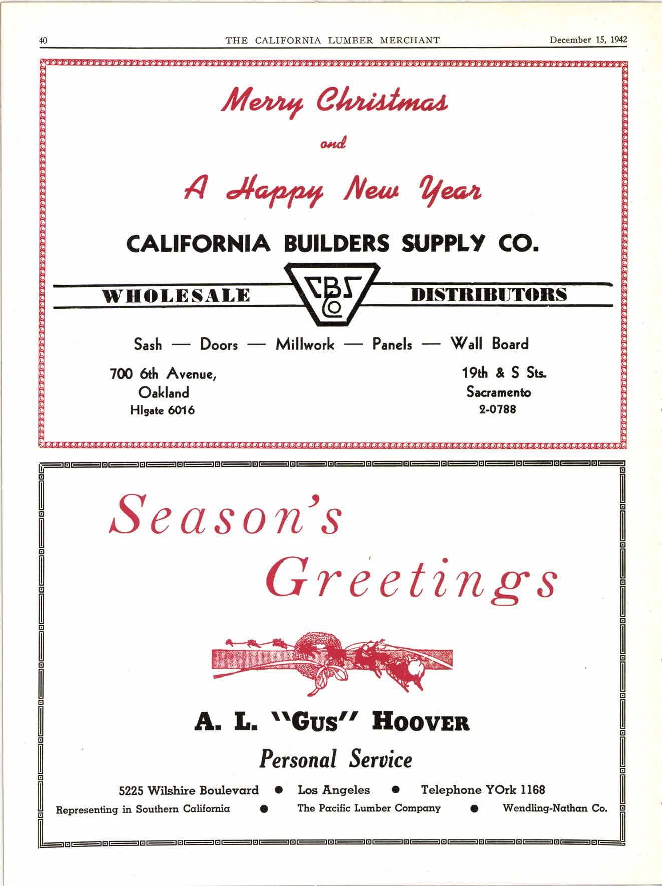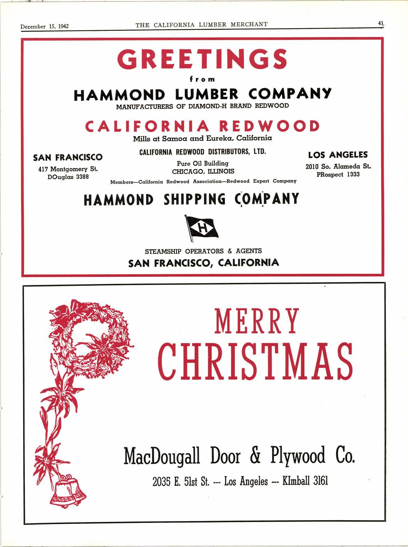 Seasorrts Greetings iilctltAt D00R SALES C0. SASH, OF CALIFORNIA WHOLESALE DOORS & PLy\7OOD SAN FRANCISCO l0 TIIE CALIFORNIA LUMBER MERCHANT December lS, 1942
