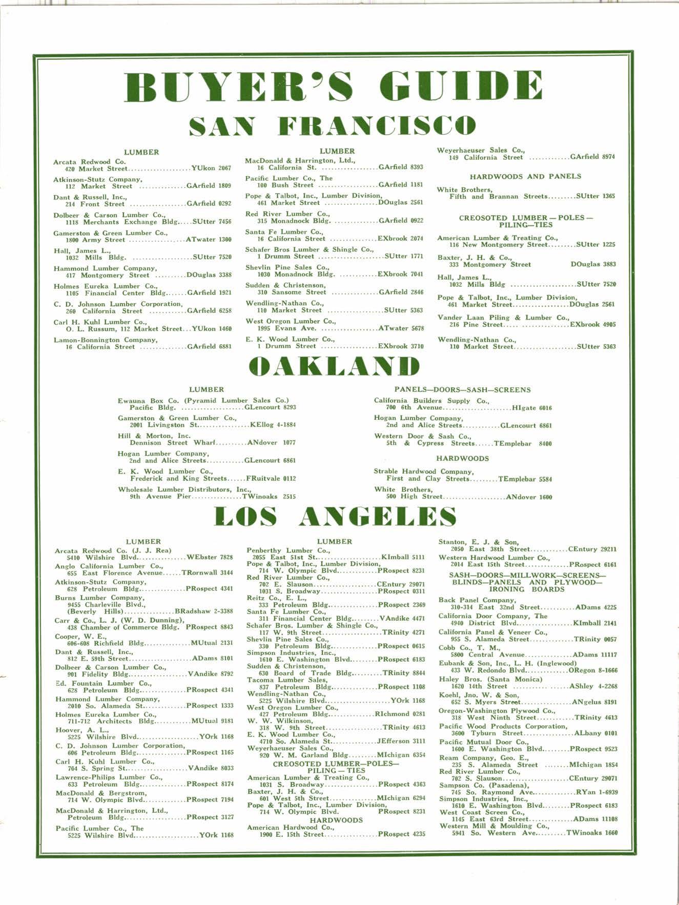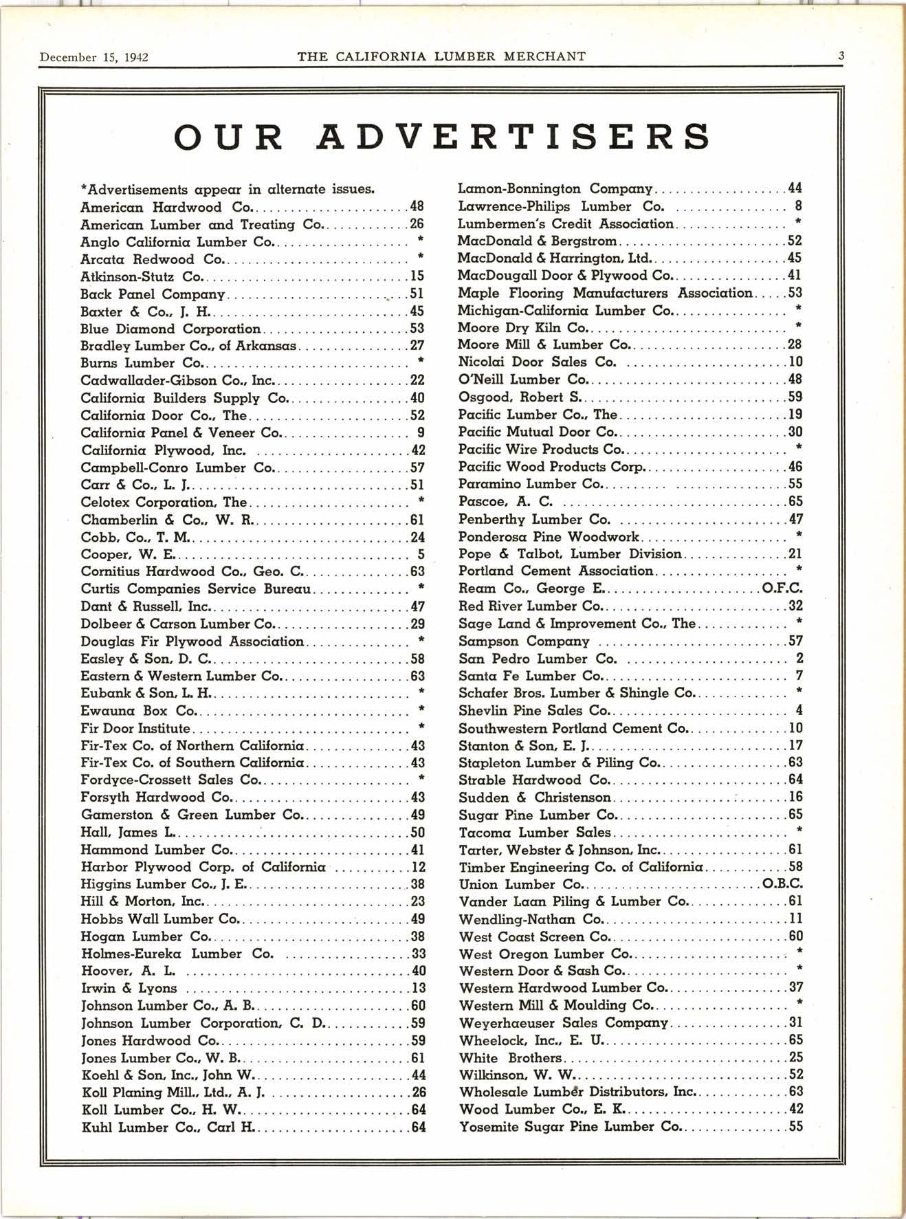 *Advertisements cppeqr in alternate issues. American Hcrdwood Co.. .... .48 Americqn Lumber cnd Trecting Co.. .26 Anglo Ccrlilornicr Lumber Co.. Arccrtcr Redwood Co.. Atkinson-Stutz Co. .....15 Bcrck Pcnel Compcny. .. .... .51 Bqxter & Co., I. H.. ... .45 Blue Dicmond Corporcrtion.. ... .53 Brcdley Lumber Co., oI Arkcrnscs. .. ...27 Burns Lumber Co.. Ccrdwqllcrder-GibsonCo.,Inc.. ......22 Cclifornic Builders Supply Co.... ........40 Cclilornicr Door Co., The. .. ....52 Calilornicr Pcrnel & Veneer Co.. . I Ccrlifornic Plywood, Inc. . .... .42 Ccmpbell-Conro Lumber Co.. .57 Ccrrr & Co., L. I.. Celotex Corporcrtion" The. Chcmberlin & Co., W. R.. ......61 Cobb, Co., T. M.. ...24 Cooper, W. E.. .. .... . 5 Comitius Hcrdwood Co., Geo. C.. .63 Curtis Compcnies Service Burecru. Dcmt d Russell, Inc.. . .47 Dolbeer & Ccrrson Lumber Co.. . ... .29 Douglcs Fir Plywood Associction.. Ecsley 6 Son" D. C.. ........58 Ecrsternd Western Lurnber Co.... .63 Eubqnk & Son" L H.. Ewcunc Box Co.. Fir Door Institute. Fir-Tex Co. ol Northem Cqlilonria. ..43 Fir-Tex Co. of Southern Calilornicr. .43 Fordyce-Crossett Sales Co.. Forsyth Hqrdwood Co.. .. .. ..43 Gamerston d Green Lumber Co... . .49 Hall, Jcmes t.. ... .50 Hammond Lumber Co.. .. ..41 Hcrrbor Plywood Corp. oI Ccrlilornicr .....12 Higgins Lumber Co- I. 8.. ... ... ... .38 Hilt & Morton, lnc.... ........23 HobbsWall Lumber Co.. .....49 Hogcn Lumber Co.. . .38 HoLnes-Eurekcr Lumber Co. ......33 Hoover, A. L. . ... ....40 Inrin&Lyons ........13 Johnson Lumber Co., A. 8.. .60 Johnson Lumber Corporcrtion" C. D.. .59 Jones Hcrdwood Co.. ..59 Jones Lumber Co., W. 8.. .61 Koehl & Son" Inc.,Iohn W... . .......44 KoU Plcnring MiU., Ltd,, A. I. . .......26 Koll Lumber Co., H. W.. .....64 Kuhl Lumber Co., Carl IL. .........64 L<rmon-Bonnington Compcmy. ......44 Icwrence-Philips Lumber Co. .. . I Lumbermen's Credit Associction McrcDonald & Bergstrom .. .. .52 MccDoncrld&Hcrrington"Ltd.. ......45 McrcDougcrll Door & Plywood Co.. ...41 Mcrple Flooring Mcmufccturers Associcrtion. .. ..53 Michigtrn-Cclilornicr Lumber Co.. Moore Dry Kiln Co.... Moore Mill & Lumber Co.... .......28 NicolciDoorSclesCo... .........10 ONeill Lumber Co.... ... .48 Osgood, Robert S..... .......59 Pcrcilic Lumber Co., The. .. ..19 Pcrcilic Mutucl Door Co.. .. .30 Pcrcilic Wire Products Co.. Pcrcific Wood Products Corp.. .46 Pcrcrmino Lumber Co.... ....55 Pcscoe, A. C. . ......65 Penberthy Lumber Co. . ....47 Ponderoscr Pine Woodworlc. Pope & Tclbot, Lumber Division. .. ......2L Portlcnd Cement Aseociction Recrr Co., George E... ..O.F.C. Bed River Lumber Co... . .....32 Scrge Lcnd & Improvement Co., The... Sonpson Compcny .57 Scrn Pedro Lumber Co. . ...... 2 Sqntcr Fe Lumber Co.... ..... 7 Schaler Bros. Lumber & Shingle Co.. Shevlin Pine Sales Co.. . .. 4 Southwestern Portlqnd Cement Co.. . .. .. .10 Stcmton & Son" E. I... ...... .17 Stcpleton Lumber & Piling Co.... .........63 Strable Hardwood Co.. . .64 Sudden d Christenson.... .;.......16 Sugcrr Pine Lumber Co.. .. .. .65 Tccomc Lumber Scrles. Tarter, Webster & Johnson" Irrc.. . .. .61 Timber Engineering Co. oI Ccrlilornicr. .... .58 Union Lumber Co... . ....O.B.C. Vcnder Lcrcrn Piling d Lumber Co.. . . ....61 Wendling-Ncrthcn Co.... .....11 West Cocst Screen Co.. . .60 West Oregon Lumber Co.. .. Western Door & Scrsh Co.. Western Hcrrdwood Lumber Co.... ..37 Western tUill & Moulding Co.... Weyerhceuser Scrles Compcmy. .3I Wheelock, Inc., E. U.... . .65 White Brothers. .....25 Wilkinson" W. W.. .....52 Wholescrle Lumbdr DisEibutors, Irrc.. . .. .63 Wood Lumber Co., E. K..... .......42 Yosemite Sugcr Pine Lumber Co.. .. ... .55