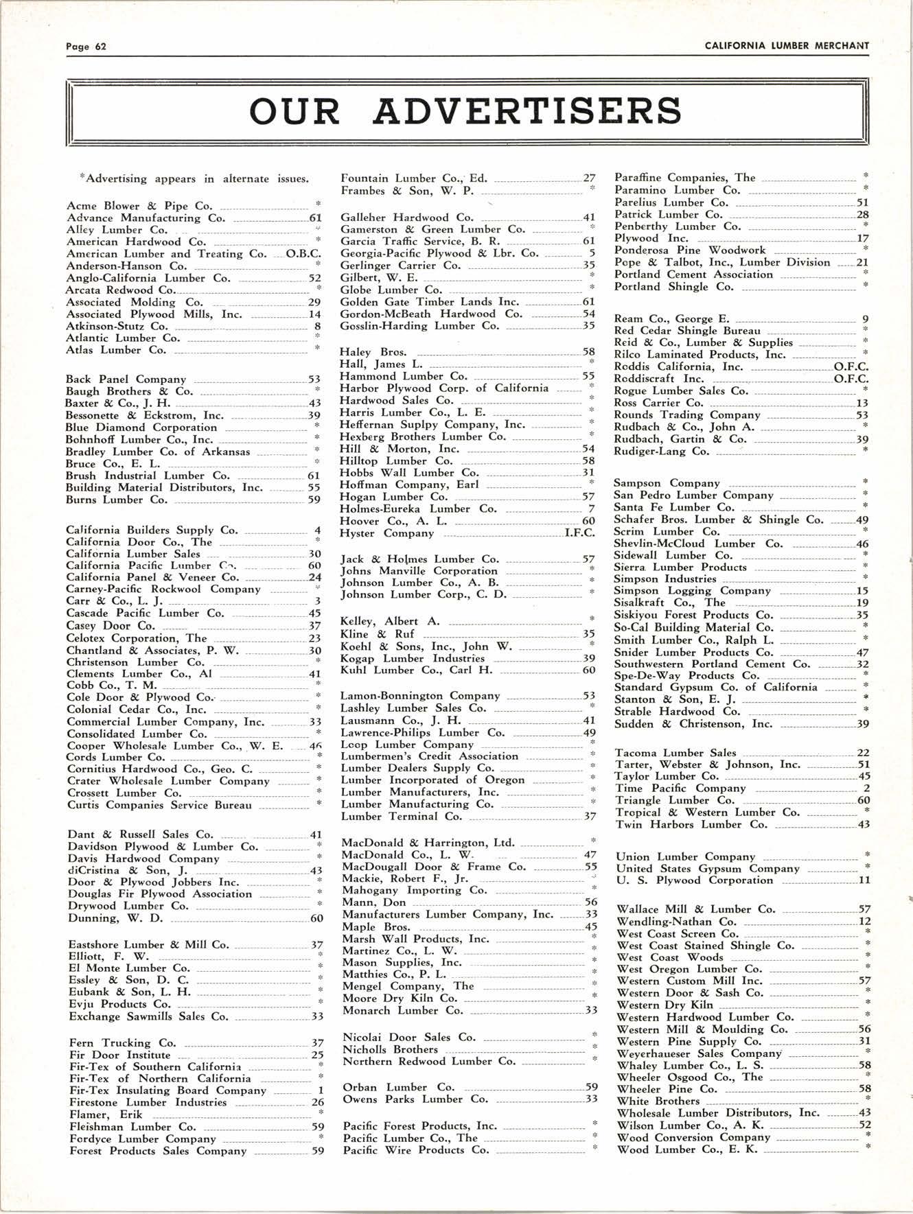 Webster 6 lohuson, Ins. (t!) DOuglos 2-2060 Tcylor Lumber Co. (Floyd W. Elliort) (lt) DOuglcs 2-{2ll E. K. Wood Lumber Co. (ll) ...E)GrooL 2-3710 Weyerhceuser Sclee Co. (8) .....GArlield l-89?! HARDWOODS Bruce Co., E. L. (3). .....MArhet l-1839 Dqvis Hctdwood Co. (9) .TUxedo 5-62i12 I. E. Higgins Lumber Co. (2il) ..VAlencic {.87$ ServEnte Hardwood Compqny (2,1) VAlencic l-{200 White Brothers (24) .ATwqter 8-lE0 sAsH-DOOnS-PLYWOOD Asgocicted Plrryood Millg, lac. (%if*or., Z-gggZ Horbor Plywood Corp. oI Colilo-i"Mj?1., l_6205 Nicolci Door Sales Co. (10) ......Mlssion 7-7920 Roddiscrolt Inc. (24) .....JUniper t[-2136 Simpson Industries (Il) .YULor 8-6{50 Uaited States Plywood Corp. (7) HEmlock l-8191 CREOSOTED LUMBEN_POLES_ PI].INGI_TIES Americqn Lumber d rreating co' (8irtt", t-tozg Bcxter, J. H. d Co. (4) ........DOuglc 2-3883 HcIl, Jcaes L., (4) .....SUtter l-75211 MccDouold d Hcrrinston Ltd' (latrr"ta t-essz Pope 6 Tclbot, Inc., Lumber Divisioa ({) DOugIas 2-561 Vcader Lqcn Piliqs d Lunber Co. (S)rook 2-{90{ Weadliag-Ncthcn Co. (4) .SUtter l-5363 Wheeler Piae