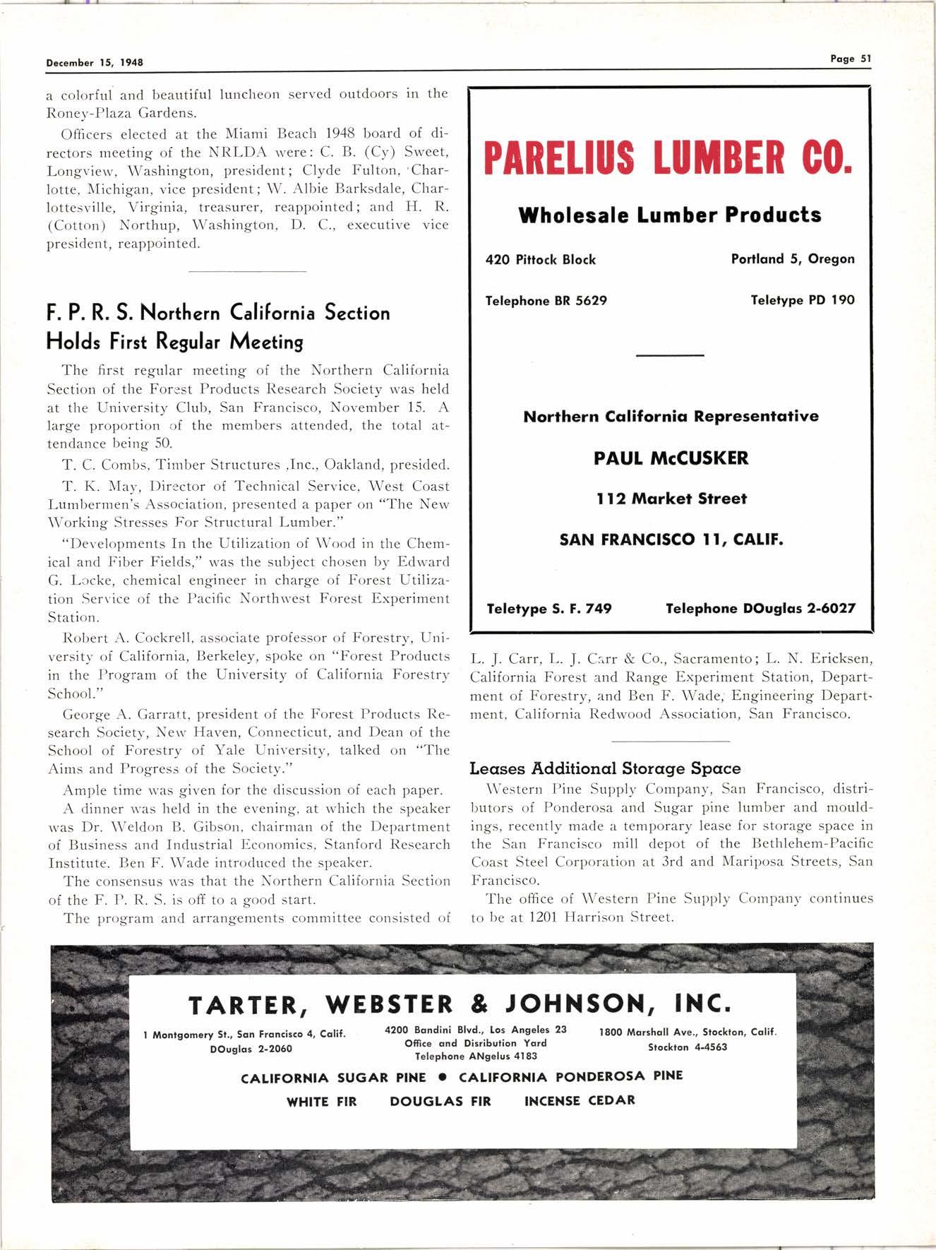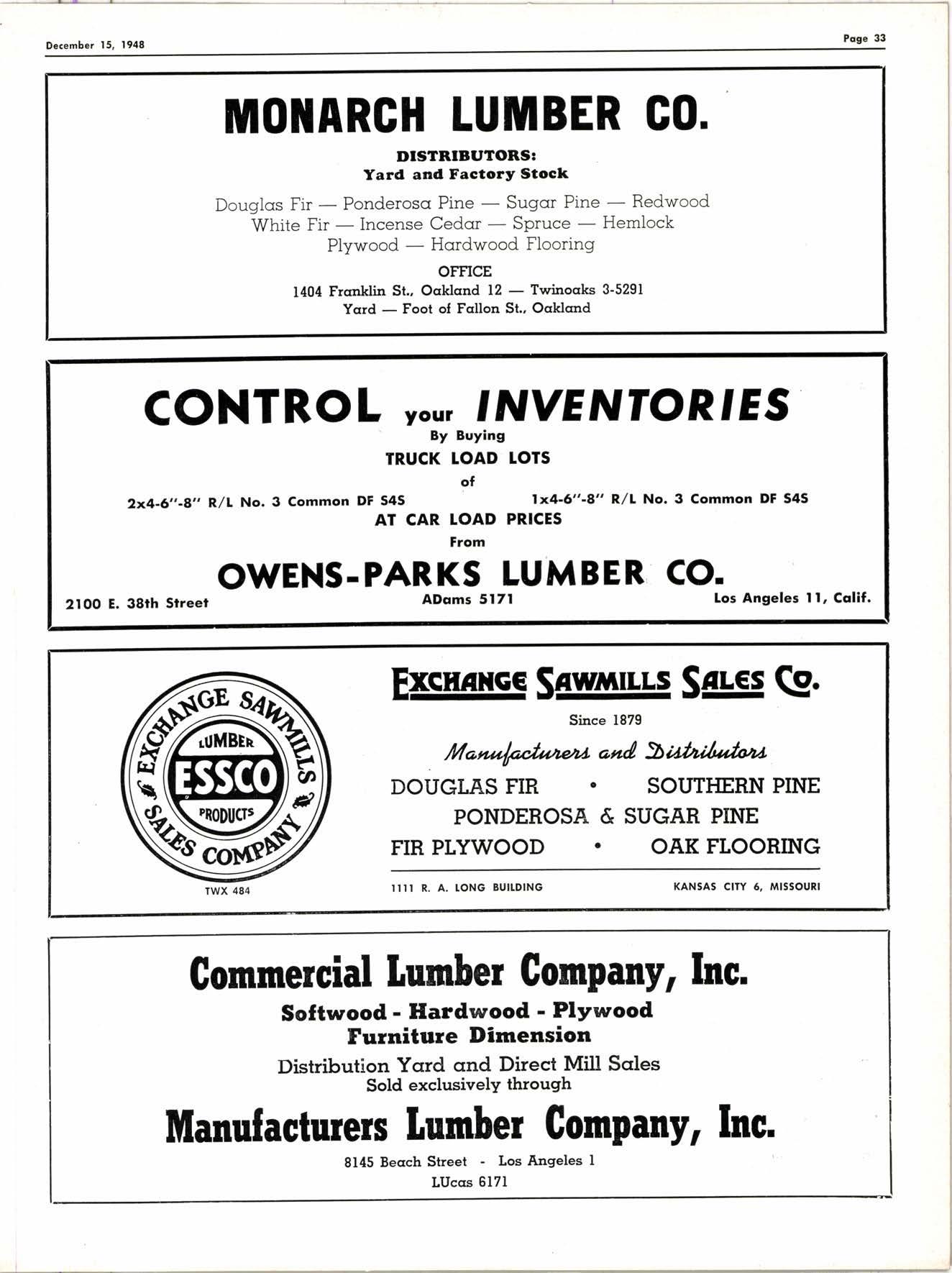 Iacorporcted uder the lcm oI Cclilomiq l. C. Dionne, Pres. ald Trecs.; I. E. Mcrlia, Vice-Pres,; W. T. Btqck, Secretcry Publisbed the lst od l5th od each month qt 508-9-10 Centrcl Building, 108 West Sixth Street, Lo: Aageles, Ccli!., Telepbone VAndiks rf565 Enlered c Secoad-closa Dctter SeptEnber 25, 1922, qt the Post Offica at Los Aageles, Ccliloraia, uqder Act ol Mcrch 3, l8?9 W. T. BLACE ll2 Mcrlet St. Sca Frcucigco ll M. ADAMS Circulciion Mcacger Poge 2 CA1IFORNIA TUIIBER IIERCHANT Subscription Price, $2,00 per Yetrr Single Copies, 25 cents eqch LOS ANGELES 14, CALIFORNIA, DECEMBER I5. 1948 Advertising Ecter on Appliccrtion
