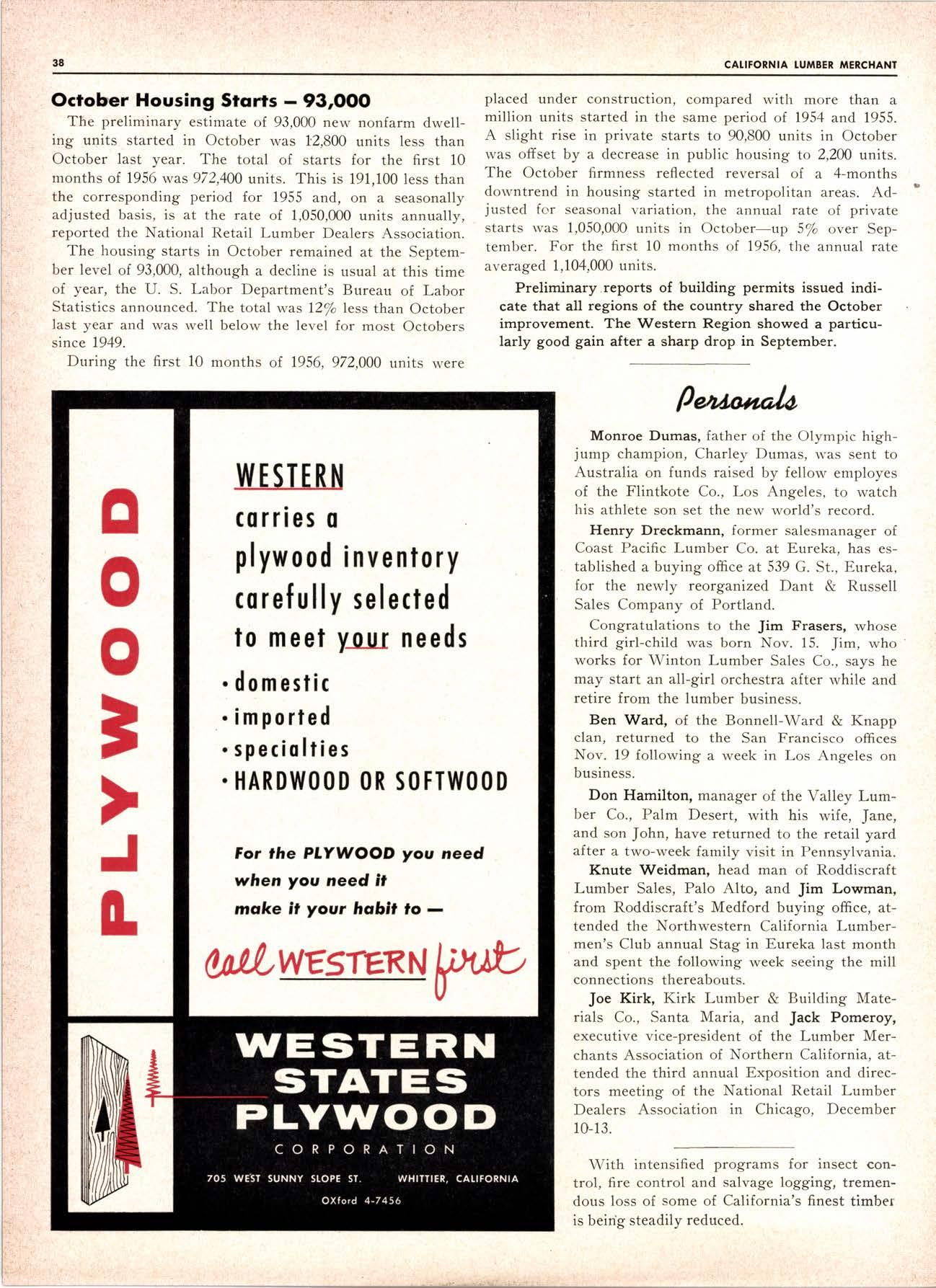 The preliminary estimate of 93,000 new nonfarm dwelling units started in October was 1'2,800 units less than October last year. The total of starts for the first 10 months of 1956 was 972,4A0 units. This is 191,100 less than the corresponding period for 1955 and, on a seasonally adjusted basis, is at the rate of 1,050,000 units annually, reported the National Retail Lumber Dealers Association.