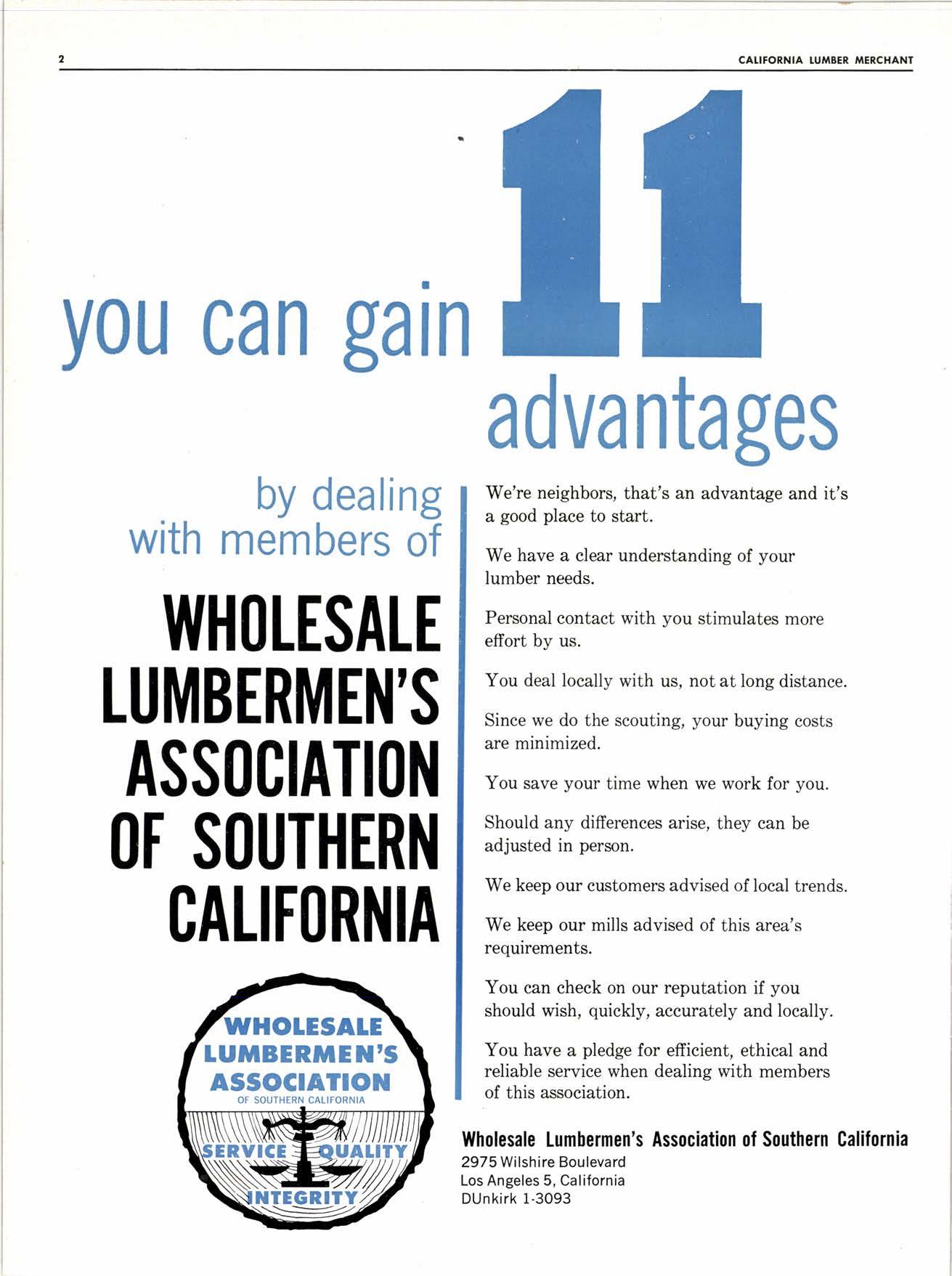 Wholesale Lumbermen's Association of Southern California 2975 Wi lshire Boulevard Los Angeles 5, California DUnkirk l-3093 WHOtESAtE TUiIBERTNE N'S ASSOCTATIOl{ OF SOUTHERN CALIFORNIA ERYICE #OUAIITYw