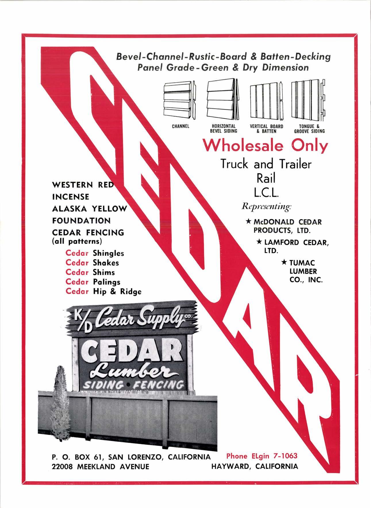 .....--.----.--.----JEfferson 7-1186 Hendrick Co., J. W.---.--.-.-.-..-_._-._--.....Htgote 4-0633 Hilf Whsf e. lumber & Supply Co.---.--.- ----------525-6002 K-D Cedor Srpply Co..--....-.---.--_.__--.----ElSin 7-1O53 Keffey, Albert A......-----..--,......---------_.LAkehurst 2-2754 Kilgore, Roberl P.--....,_-_-----.-.-..-..---_GLcnwood 6-083t loop Iumber & Mill Co.---------------.__.-[Akehurst 3-5gSO MocBeolh Hordwood Co...-..-...,.__---THornwoll 3-4390 Morinlond Iumber Co..--..--..-.-.-...-._G[enwood 4-1854 Morsholl Shingle Co.."-.--..-.----...---_---------__KEllog 4-2680 Pocific Fir Soles--.-...-...-----.----------.-___TEnpelbor 6-l 3l 3 Pocific Hqrdwood Soles--....---.----.-_---ANdover l-6342 Pocific Stud & Post Co..__---.-._.__..-..-._-_-GArden 3-9222 Peerless Lumber Co....-..------.-.-.....-_-[Ockhoven 2-7700 Son Jose Plywood lumber Co,------._------CHerry 3-3120 Sonto Fe Lumber, lnc.--.--,__-_-_-......-__-Otympic 8-6000 Stondord Iumber Co.---.--.-....--.----.-.-.DAvenporl 6-9669 Slroble Lumber Compony-----------.....TEmpelbor 2-5584 Torler, Webster & Johnson--.-.----.---..SYcomore 7.2351 T. H. & F. Soler, Inc.----.-..--.---...-.--.--DAvenport 1-2525 T. H. & F, Soles, Inc.--.-....-----------..-.-GLenwood 4-2310 Triongle Iumber Co..----...-.---.---.------[Andscope 4-9595 Tri-Stote Plywood (Beckslrom & CoJ---.---...------.-----.-DAvenport l-2012 Twin Horbors [umber Co,...-.--i--..DAvenport 1-2525' U.S. Plywood Corp. {Ooklond)---.----TWinooks 3-5544 U.S. Plywood Corp. {Sonto Cloro).--.....CHerry 3-5286 Weslern Pine Supply Co.--...-..".-.-...--..OLympic 3-7711, Whife Brolhers ....--.-..ANdover t-1600 Wholesole Building Supply, Inc..---TEmpelbor 2-6964 Woodside Iumber Co..----.--------.--.----.Dlomond 3-5644 PANETS-DOORS-SA5H-SCREENS NAIIIWORK_BUITDING MATERIATS Artesio Door Co., Inc. (Son Jose).-..ANdrews 4-8862 Coloveros Cement Co..---------....-.-.--GLencovrl 1-71OO Morsholl Shingle Co..---.--.-.-.----.--------.-KEltog 4-2680 forler, Websfer & Johnson---...-.--------SYcomore 7-2351 SACRAMENTO [U'VIBER Block Diomond [umber Co.--.---.-..----G[odsfonc l-6571 Hedlund Lumber Soles.-..--------------..--.GArden 8-9O20 King's River lurnber Corp.------------...-Glodstone 5-7210 Nikkel Lumber Co., R. F..-.-.-.----..-...---lVonhoe 7-8675 Plocerville Iumber Co,...-.-.-.-..---.----..-.NAtionot 2-3385 Twin Horbors [umber Co.------.-------.-ENterprise l-0036 Wollon-Smith & Co..-.----.-.--.-----..---..-..FRontier l-7962 BUITDING AAATERIAIS Coloveros Cement Co..-.-.-.-.-.-.-.--..---.-.-.Gllbert 2-8991 Georgio-Pocific Worehouse--.-------.-.-..WAbosh. 2-963,1 [umber Deolers Moteriols Co.--.---......WAbosh 5-2751 Nofionol Whlsle. Bldg. Moteriols ------WAbqsh 2-901,1 Uniled Stoles Plywood Corp..-...---.-..Glodstone l-2891 Weyerhoeuser Compony.-..--...------.--.---WAbosh 2-9811 .,'ni iil v ,!i--11,.,(;1i-'.^;; --:r -- ? ! l:1. -ii , .': '.1 GUIDE t; ,.tfobbs Woll Lumber Co., Inc.--.---.-.-..tlllmore 6-6OOO ': -..[omon.. Lumber Co....-.. Yl)kon 2-1376 3' {tAdCloud Lumber Co...--------.-.-.----..-.-....Exbrook 2-7041 -',\ Pocific Iumber Co., The---..--.-.--.--.-...GArfield l-3717 ljlqi & Kruse lumber Co..-..-.-----..--..--i,tlssion 7-2576 Sownill Ssles Co...-.----.-.------..-------...---DElowore 4-1616 Silnqrco, lnc..--.--.-...--.--.-.--..---..-.--..Exbrook 2-8268 Torlcr; Webster & Johnson, Inc..-.-------PRospe ct 6-4200 Uaion
