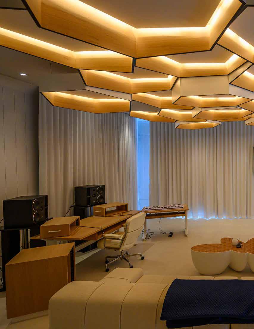 But it’s the studio’s engineering that truly sets it apart. Designed to handle high-decibel creativity, it features vibration-dampening wall systems and sound boxes embedded in the floor to absorb loud noises. The materials used throughout significantly reduce sound transmission, ensuring that every session is as clear as it is isolated from the outside world. The triple-pane glass windows are more than just a view to the outside; they’re a critical component in maintaining the studio’s acoustic integrity. Built over a span of just three months, this music studio stands as a testament to BuildLabs’ commitment to combining luxury with specialized functionality. It’s more than a building; it’s a haven for creativity, where every note resonates perfectly within its walls.