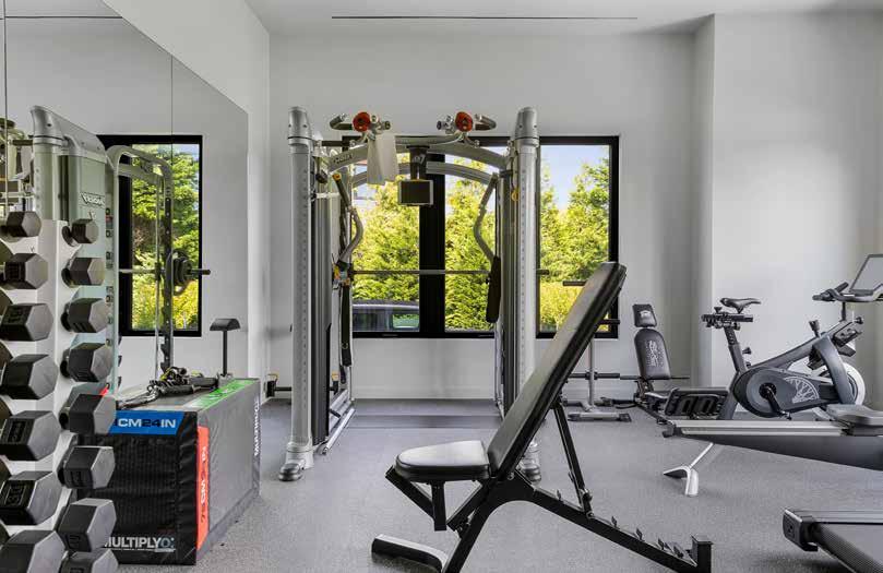 At the heart of the home is the chef’s kitchen, complete with a massive island, top-of-the-line appliances, as well as both formal and informal dining areas. The first floor includes a gym with stunning views of the estate and an adjacent laundry room, further elevating the convenience of daily life.