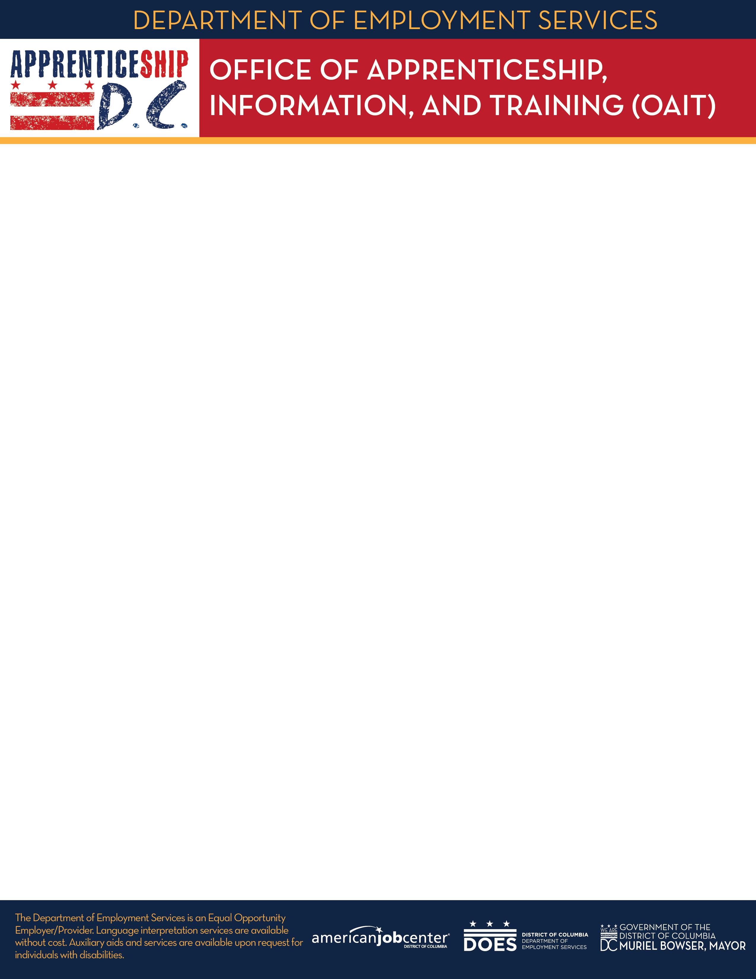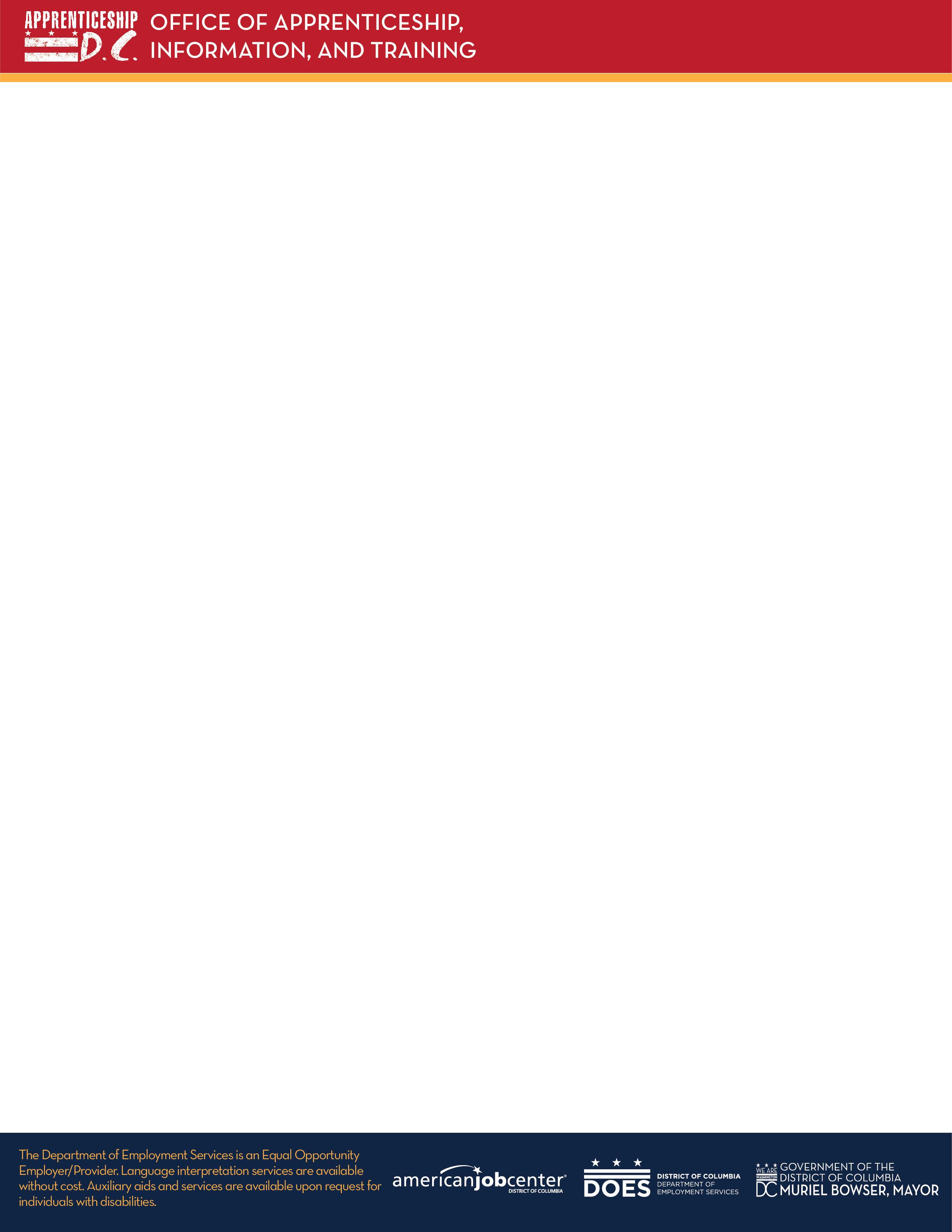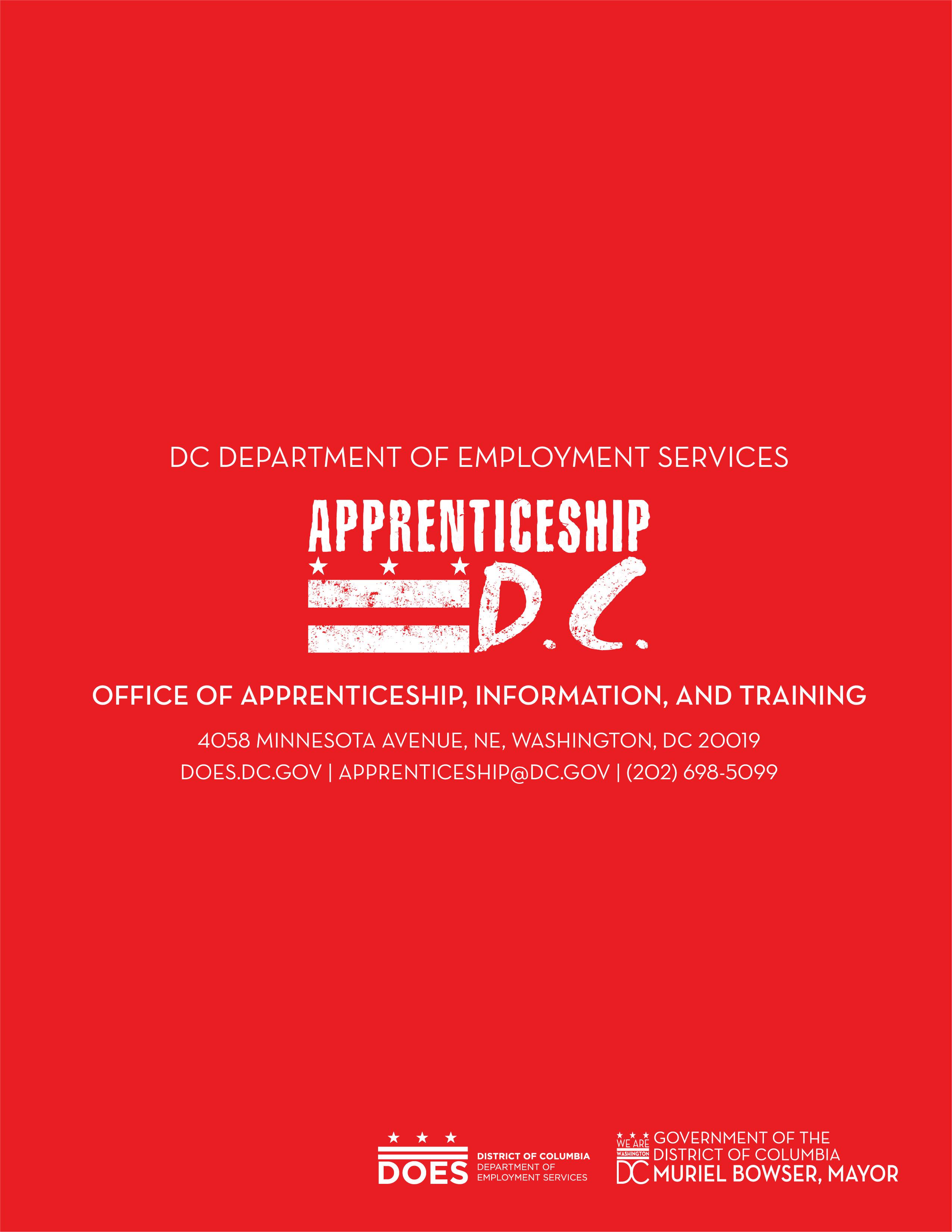 For additional questions or help completing your application, contact the DC Department of Employment Services, Office of Apprenticeship, Information, and Training, Youth Apprenticeship Program, 4058 Minnesota Avenue NE, Third Floor, Washington, DC 20019, (202) 631-5144, vincent.orange@dc.gov.