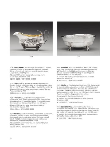 1025. KONFEKTSKÅL, av Samuel Presser, Linköping 1768. Rokoko. Oval, på volutfötter, dekor av svängda knäckar. Längd 16,5 cm, vikt 171 gram. Fötterna något intryckta, liten bristning. A Swedish 18th century silver sweet-bowl, marks of Samuel Presser, Linköping 1768. € 1.350–2.000 / SEK 12.000–18.000 1026. SOCKERSKÅL, av Erik Ernander, Uppsala 1784. Gustaviansk. Rund, på fot med genombruten pärlstavskant, delvis kannelerat liv, parställda hänklar. På locket bärknopp. Även locket med stämplar. Höjd 22 cm, vikt 405 gram. A Swedish 18th century silver sugar-bowl, marks of Erik Ernander, Uppsala 1784. € 1.100–1.350 / SEK 10.000–12.000 1027. TEKANNA, av Stephan Halling, Örebro 1788. Gustaviansk. Urnformad, på rund fot. Hög pip och svängt trähandtag. Dekor av pärlstav och stämplad brodyr. Stämplar även på locket. Höjd 20 cm. Lockknoppen skadad. blad saknas, dekordel vid nedre handtagsfästet saknas. A Swedish 18th century silver tea-pot, marks of Stephan Halling, Örebro 1788. € 2.200–2.750 / SEK 20.000–25.000