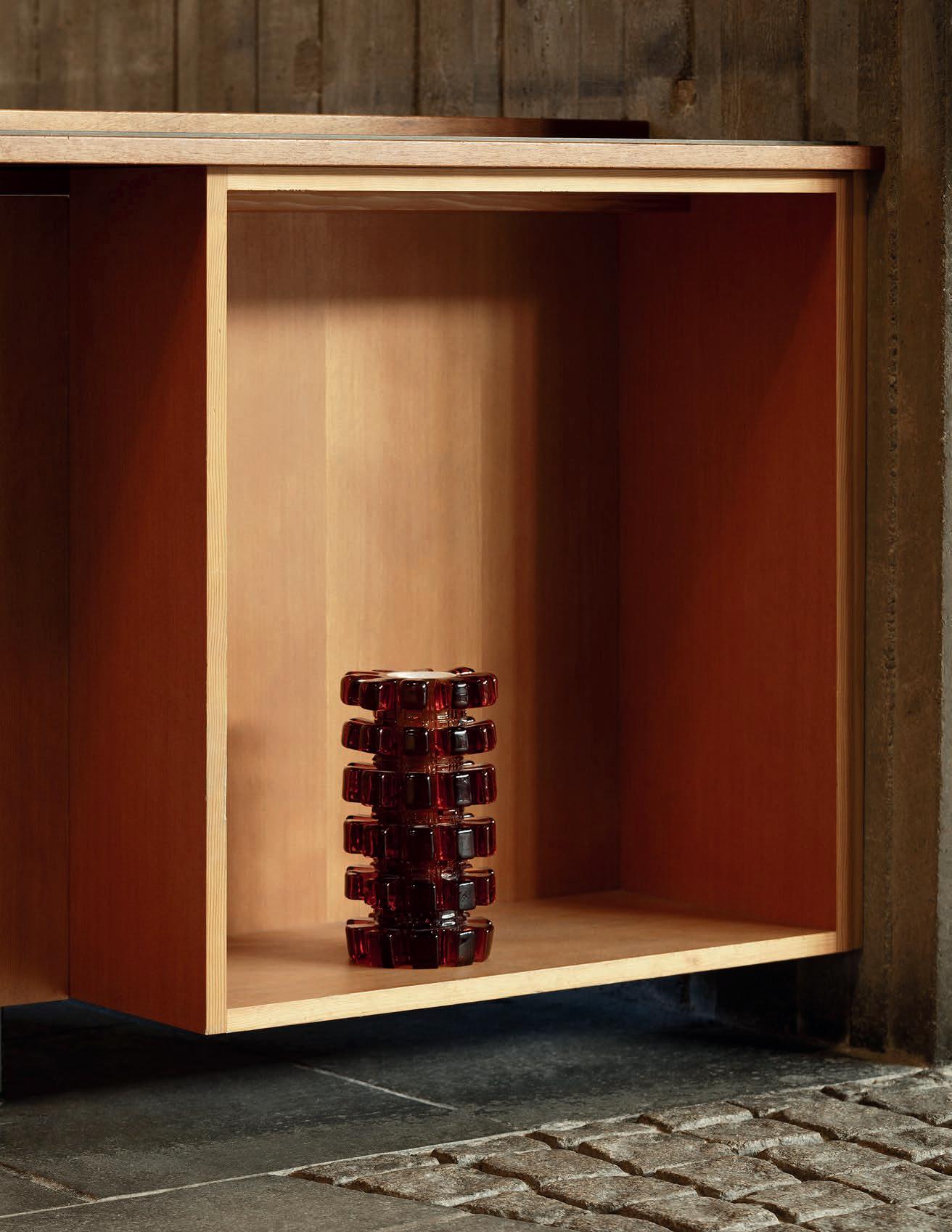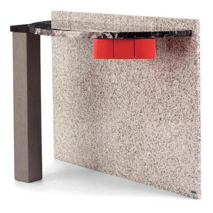 Marble, granite, pietra serena, three drawers in a frame of red lacquered wood, manufacturer’s label MEMPHIS MILANO ALDO CIBIC 1982 MADE IN ITALY. Length 106 cm, depth 43 cm, height 80 cm.