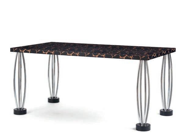 18. Ettore Sottsass (Italy, 1917–2007) a “City” dining table, Memphis, Italy, post 1983. Plastic laminate, chrome-plated legs, enamelled feet, manufacturer’s label MEMPHIS MILANO ETTORE SOTTSASS 1983 MADE IN ITALY (designer and year indistinctly stamped). Length 160 cm, width 85 cm, height 72.5 cm.