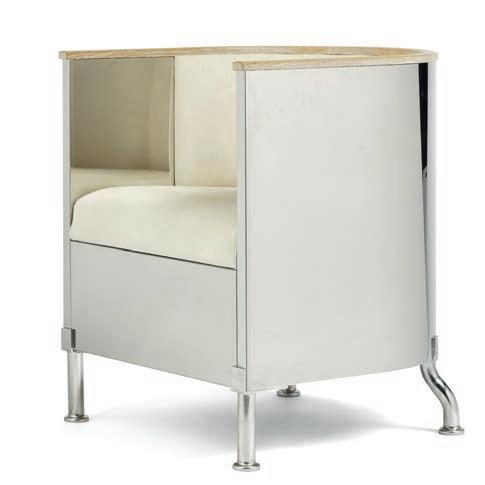 Plastic laminate, enamelled steel, lacquered wood, upholstered in polychrome textile. Length 150 cm, depth 95 cm, height 95 cm.
