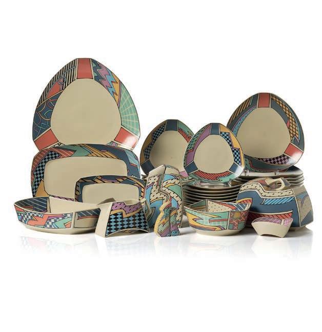 Highlights from Memphis Group – A private collection: 10. Ettore Sottsass, a ‘Park Lane’ coffee table. 14. Masanori Umeda, a ‘Parana’ bowl, Alessio Sarri Ceramiche. 4. Ettore Sottsass, a ‘Max’ bookcase. 5. Aldo Cibic, a ‘Belvedere’ console. 9. Ettore Sottsass, an ‘Ashoka’ table lamp 20. Ettore Sottsass, a ‘Callimaco’ floor lamp, Artemide. 2. Peter Shire , a ‘Big Sur’ sofa.