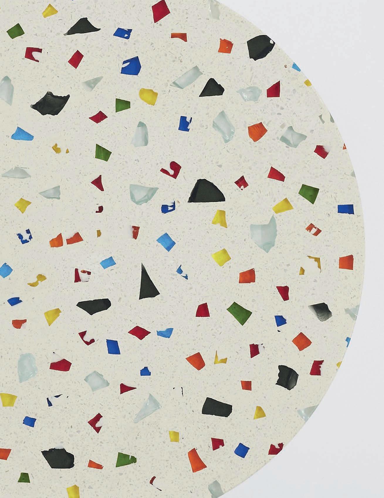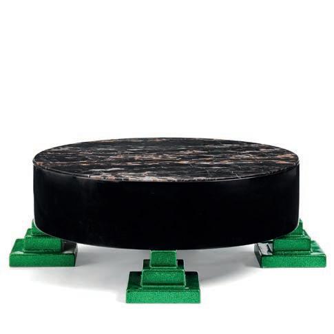Fiberglass, glittering green feet, marble top. Height 37 cm, diameter 90 cm.