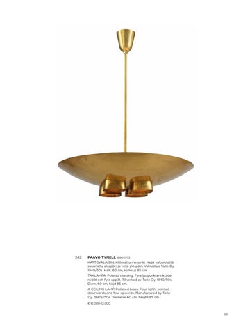 PAAVO TYNELL 1890-1973 KATTOVALAISIN. Kiillotettu messinki. Neljä valopistettä suunnattu alaspäin ja neljä ylöspäin. Valmistaja Taito Oy. 1940/50s. Halk. 60 cm, korkeus 85 cm. TAKLAMPA. Polerad mässing. Fyra ljuspunkter riktade nedåt och fyra uppåt. Tillverkad av Taito Oy. 1940/50s. Diam. 60 cm, höjd 85 cm. A CEILING LAMP. Polished brass. Four lights pointed downwards and four upwards. Manufactured by Taito Oy. 1940s/50s. Diameter 60 cm, height 85 cm. € 10.000–12.000