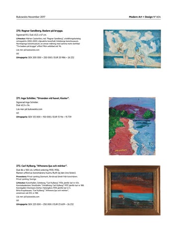 272. Carl Kylberg, ”Aftonens ljus och mörker”. Duk 86 x 100 cm. Utförd omkring 1935–1936. Ramen utförd av konstnärens hustru Ruth (ej den inre listen). Proveniens: Privat samling Danmark, förvärvad direkt från konstnären. Privat samling, Sverige. Litteratur: Konsthallen, Göteborg, ”Carl Kylberg”, 1936, jämför kat nr 454. Konstakademien, Stockholm, ”Utställning. Carl Kylberg” 1937, jämför kat nr 188. Konstgalleri Stenmans Dotter, Helsingfors 1939, jämför kat nr 5. Brita Knyphausen, ”Carl Kylberg”, ”Aftonens ljus och mörker”, omskriven sid 253, nr 188. Läs mer på bukowskis.com (d)