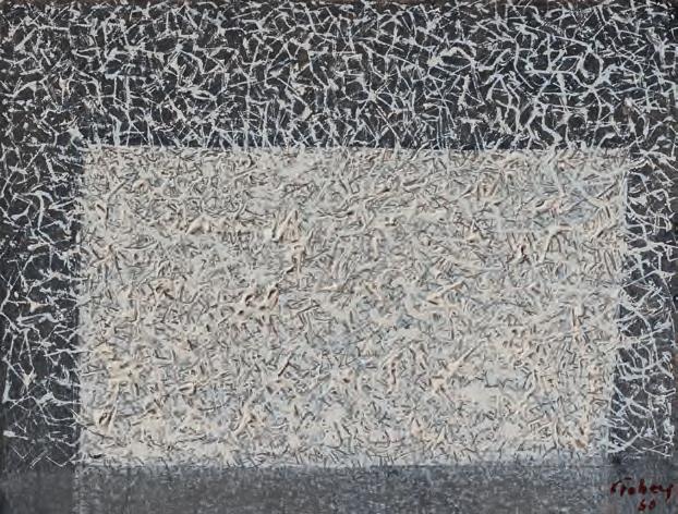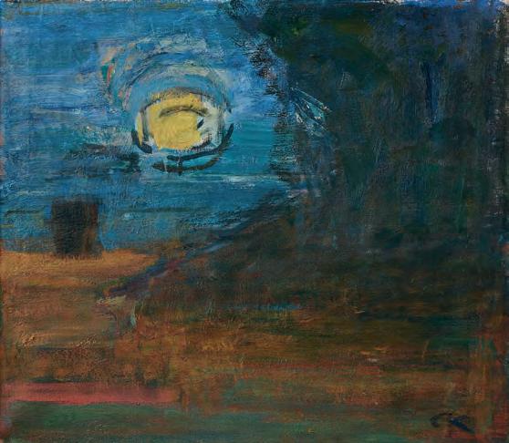 581. Erik Olson (Sverige, 1901–1986) ”Litania till Morgonstjärnan”. Signerad Erik Olson och daterad –56. Duk uppfäst på pannå, 28 x 34 cm.