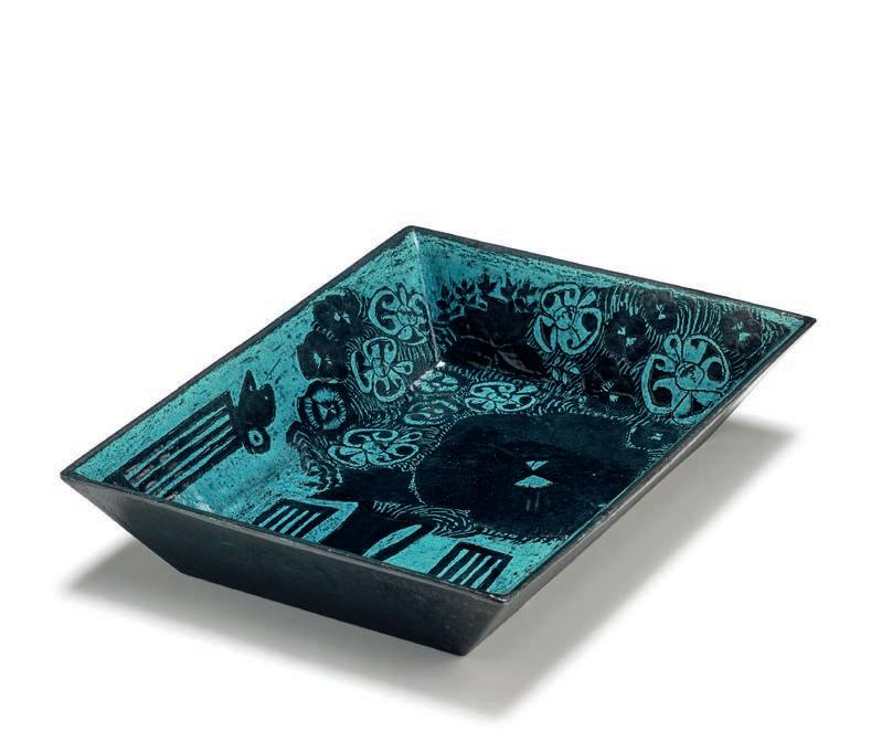 Irregular shape, decoration of fish and aquatic plants in green against a lighter background, as well as clear glass, signed Orrefors Sweden Graal no. 1500, and signed by Edward Hald. Height 14.5 cm, 18 x 13.5 cm.