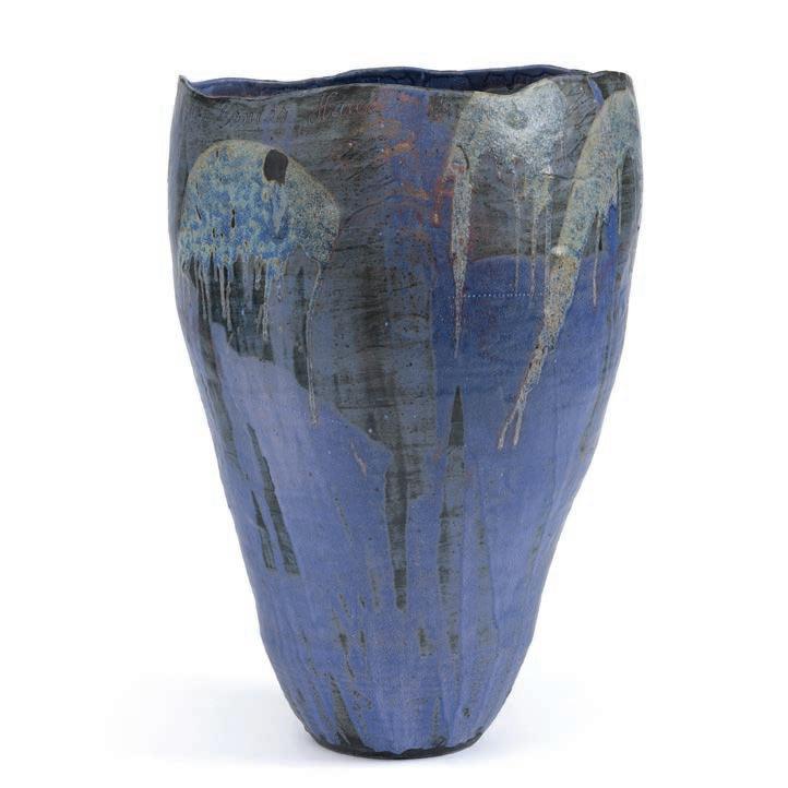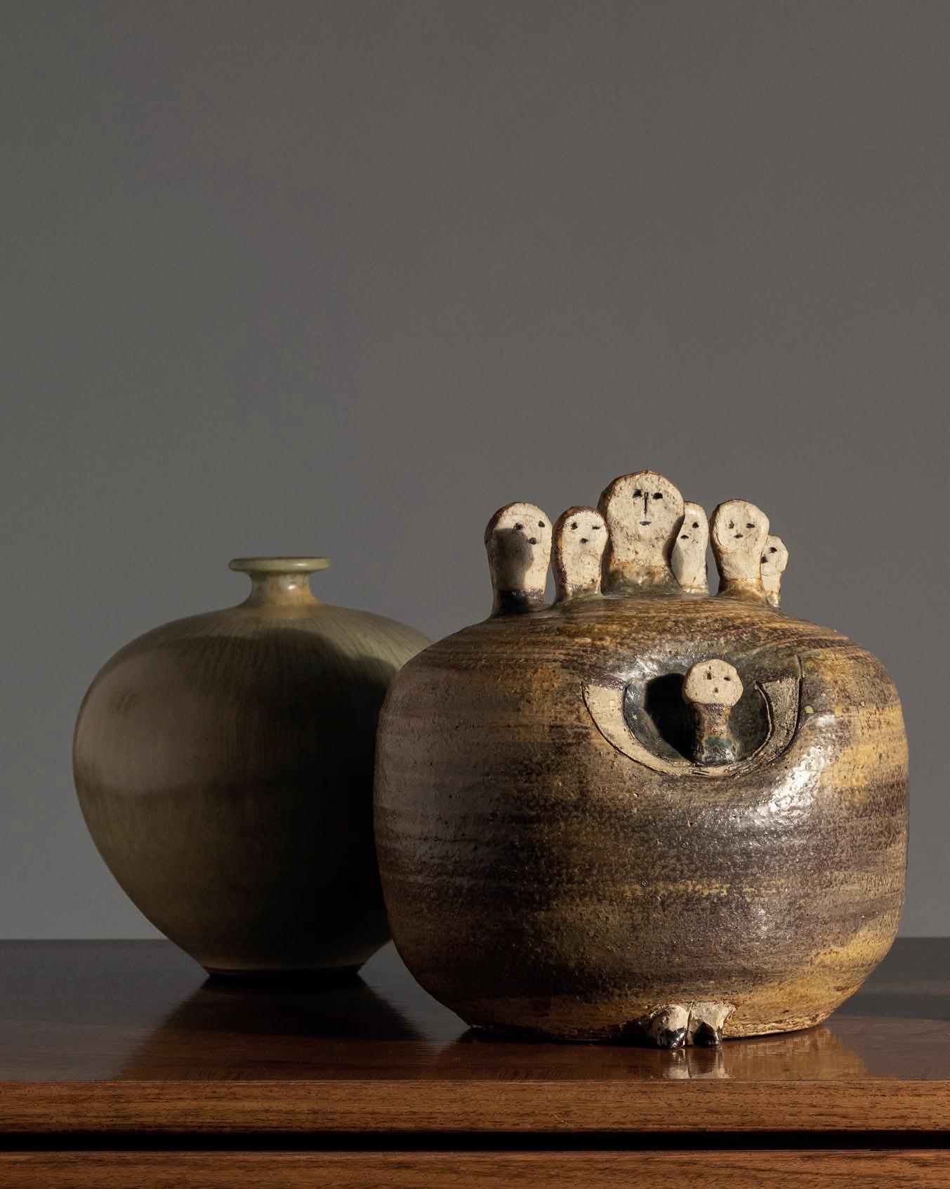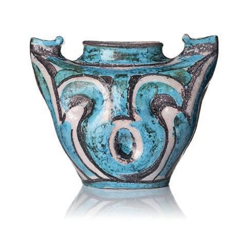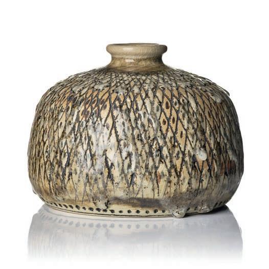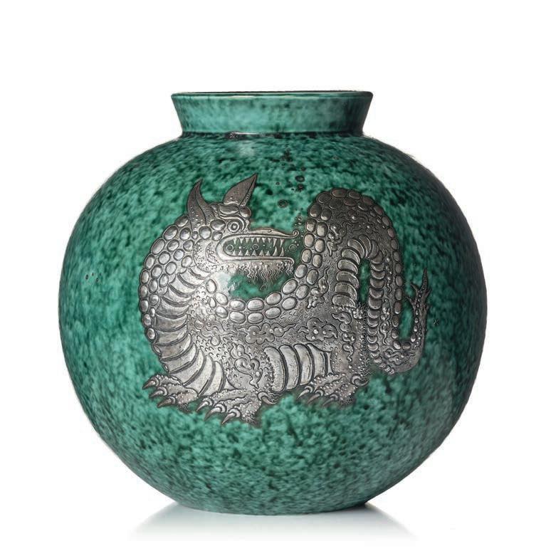 63. Stig Lindberg , a stoneware vase, Gustavsberg Studio 1962. 38. Gunnar G:son Wennerberg , an Art Nouveau glazed creamware vase, Gustavsberg, Sweden, early 20th century. 41. Wilhelm Kåge , a “Farsta” stoneware sculpture/vase, Gustavsberg Studio 1959.