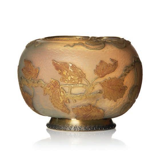 22. Daum Frères (France) an “Aurore” (Boule cabossée) Art Nouveau cameo glass bowl by Jacques Gruber, Nancy, France, 1890s. Etched and painted decoration, bulbous multi-faceted mouth, decoration of plane trees in relief in brown and gold against an opalescent yellow-toned ground, signed in gold DAUM with the Cross of Lorraine, the base with white metal mount. Height 15.5 cm, total diameter 20.5 cm.