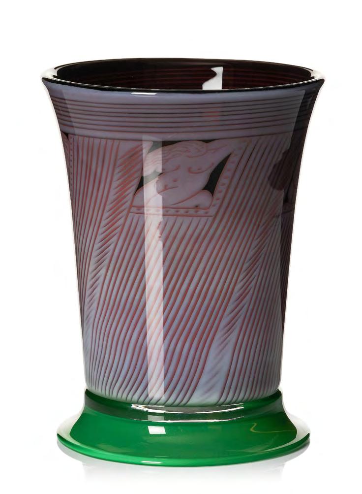 34. Gunnar Cyrén (Sverige, 1931–2013) vas, graal, Orrefors 1989. Dekor i rött, grått och svart av fyra olika kvinnofigurer inramade av randiga fält, på grön fotklack, signerad Orrefors 958972 Gunnar Cyrén EA 1–89. Höjd 21,5 cm, diameter 16,5 cm.
