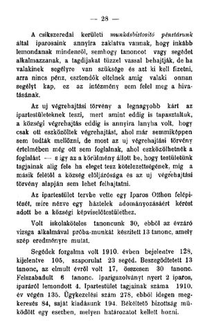 A csíkszeredai kerületi munkásbiztositó pénztárunk által iparosaink annyira zaklatva vannak, hogy inkább lemondanak mindenről, semhogy tanoncot vagy segédet alkalmazzanak, a tagdijakat tűzzel vassal behajtják, de ha valakinek segélyre van szüksége és azt ki kell fizetni, arra nincs pénz, esztendők eltelnek amig valaki onnan segélyt kap, ez az intézmény sem felel meg a hivatásának. Az uj végrehajtási törvény a legnagyobb kárt az ipartestületeknek teszi, mert amint eddig is tapasztaltuk, a községi végrehajtás eddig is annyira lanyha volt, hogy csak ott eszközöltek végrehajtást, ahol már semmiképpen sem tudták mellőzni, de most az uj végrehajtási törvény értelmében még ott sem foglalnak, ahol eszközölhetnék a foglalást — s igy az a körülmény állott be, hogy testületünk tagjainak alig fele ha eleget tesz kötelezettségének, mig a másik felétől a község elöljárósága és az uj végrehajtási törvény alapján sem lehet felhajtatni. Az ipartestület tervbe vette egy Iparos Otthon felépítését, mire nézve egy háztelek adományozásáért kérést adott be a községi képviselőtestülethez. Volt iskolaköteles tanoncunk 30, ebből az évzáró vizsga alkalmával próba-munkát készített 13 tanonc, amely szép eredményre mutat. Segédek forgalma volt 1910. évben bejelentve 128, kijelentve 105, szaporulat 23 segéd. Beszegödtetett 13 tanonc, az elmúlt évről volt 17, összesen 30 tanonc. Felszabadult 6 tanonc. Iparigazolványt nyert 2 iparos, iparáról lemondott 4. Ipartestület tagjainak száma 1910. év végén 135. Ügykezelési szám 278, ebből idegen megkeresés 84, saját kiadásunk 194. Békéltető bizottság működött egy esetben, melyen határozatot kellett hozni.