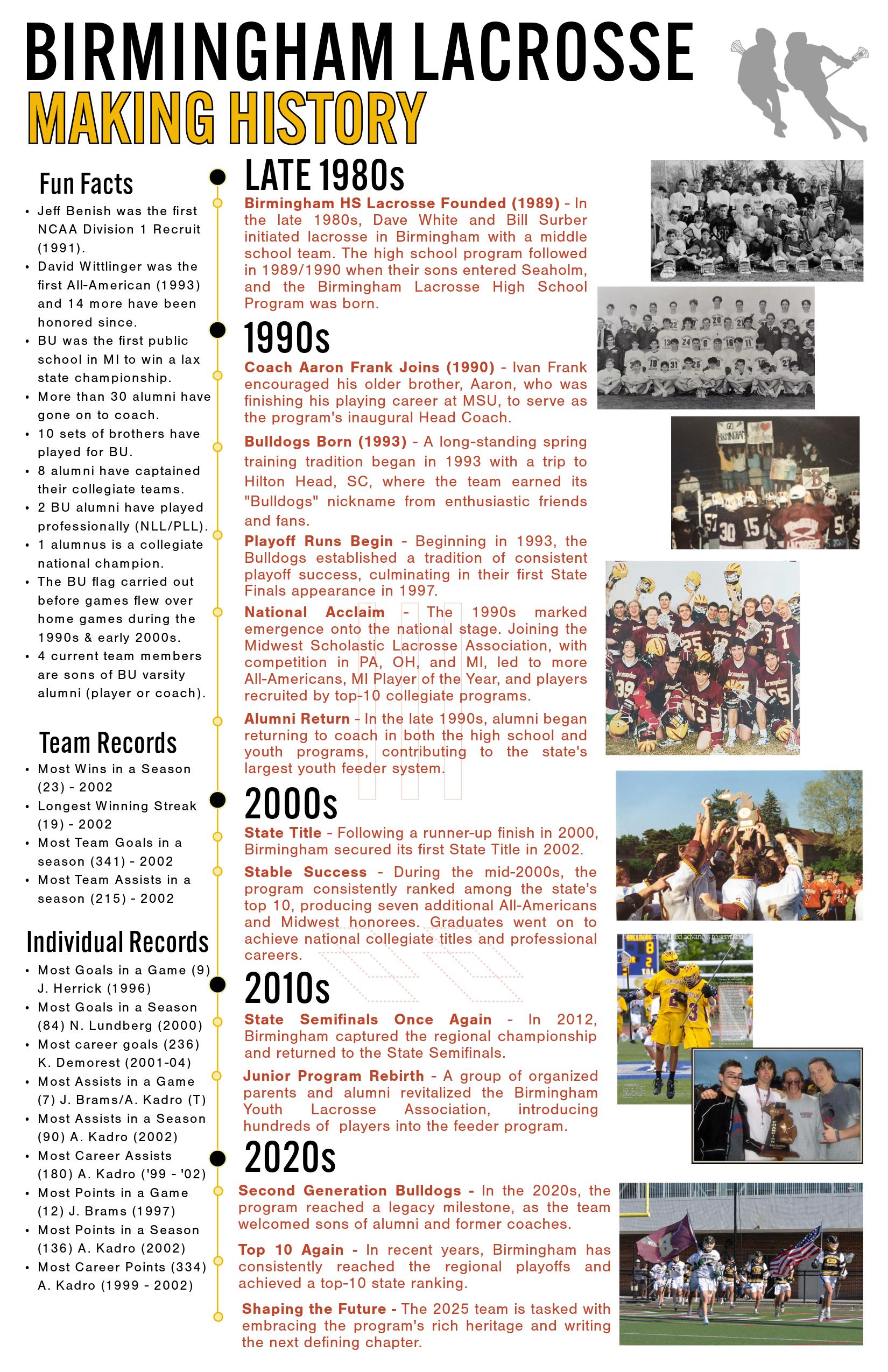 Since 1989, Birmingham Youth Lacrosse has helped young players learn the skills necessary to carry them into the highest levels of lacrosse. Birmingham Youth Lacrosse Association is a premier Michigan based non-profit organization dedicated to promoting the game of lacrosse to the student athletes in the Birmingham/Bloomfield area. The bulldogs run teams year round (spring, summer, fall and winter season) from 1st-8th grade. We practice and play home games at Birmingham facilities with players coming from within the Birmingham community elementary and middle schools No prior lacrosse experience is required.