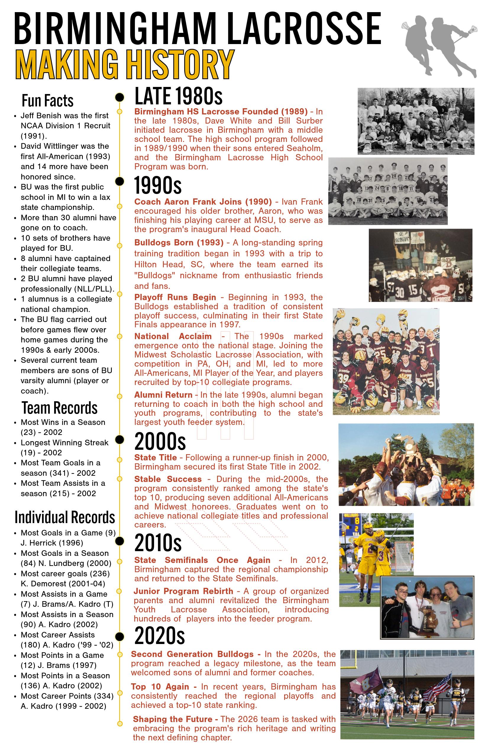 Since 1989, Birmingham Youth Lacrosse has helped young players learn the skills necessary to carry them into the highest levels of lacrosse. Birmingham Youth Lacrosse Association is a premier Michigan based non-profit organization dedicated to promoting the game of lacrosse to the student athletes in the Birmingham/Bloomfield area. The bulldogs run teams year round (spring, summer, fall and winter season) from 1st-8th grade. We practice and play home games at Birmingham facilities with players coming from within the Birmingham community elementary and middle schools No prior lacrosse experience is required.