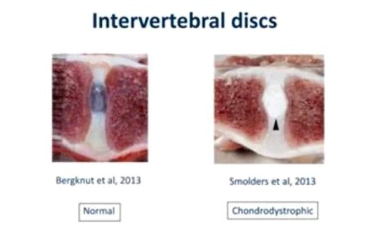 Til venstre er et billede af en normal skive, og den mørke farve viser væskeindholdet. Til højre er skiven fra en chondrodystrofisk 2 år gammel hund. Der er væsketab og tab af fleksibilitet ved CDDY, og normalt væskeindhold vil blive erstattet med porøst/mineraliseret bruskvæv/forkalkning.