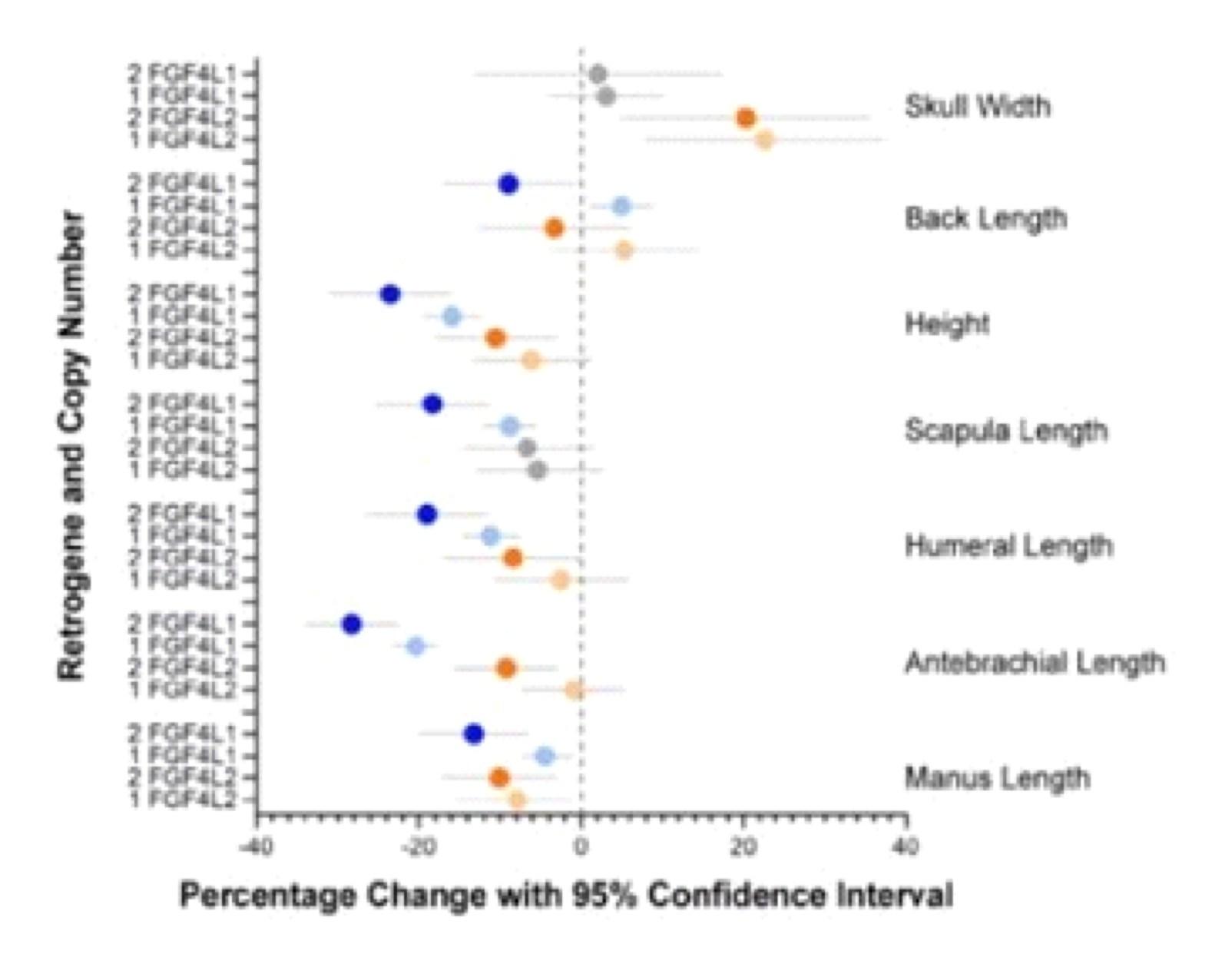 I en anden undersøgelse fra 2019 blev det fundet, at retrogen FGF4 i CFA12 regionen (men ikke bekræftet på samme kromosom) gav større bredde på øre tipperne. I andre studier på nogle racer blev det fundet, at CDDY var den eneste faktor til udvikling af skæve forben (inklusive kort ulna-syndrom).