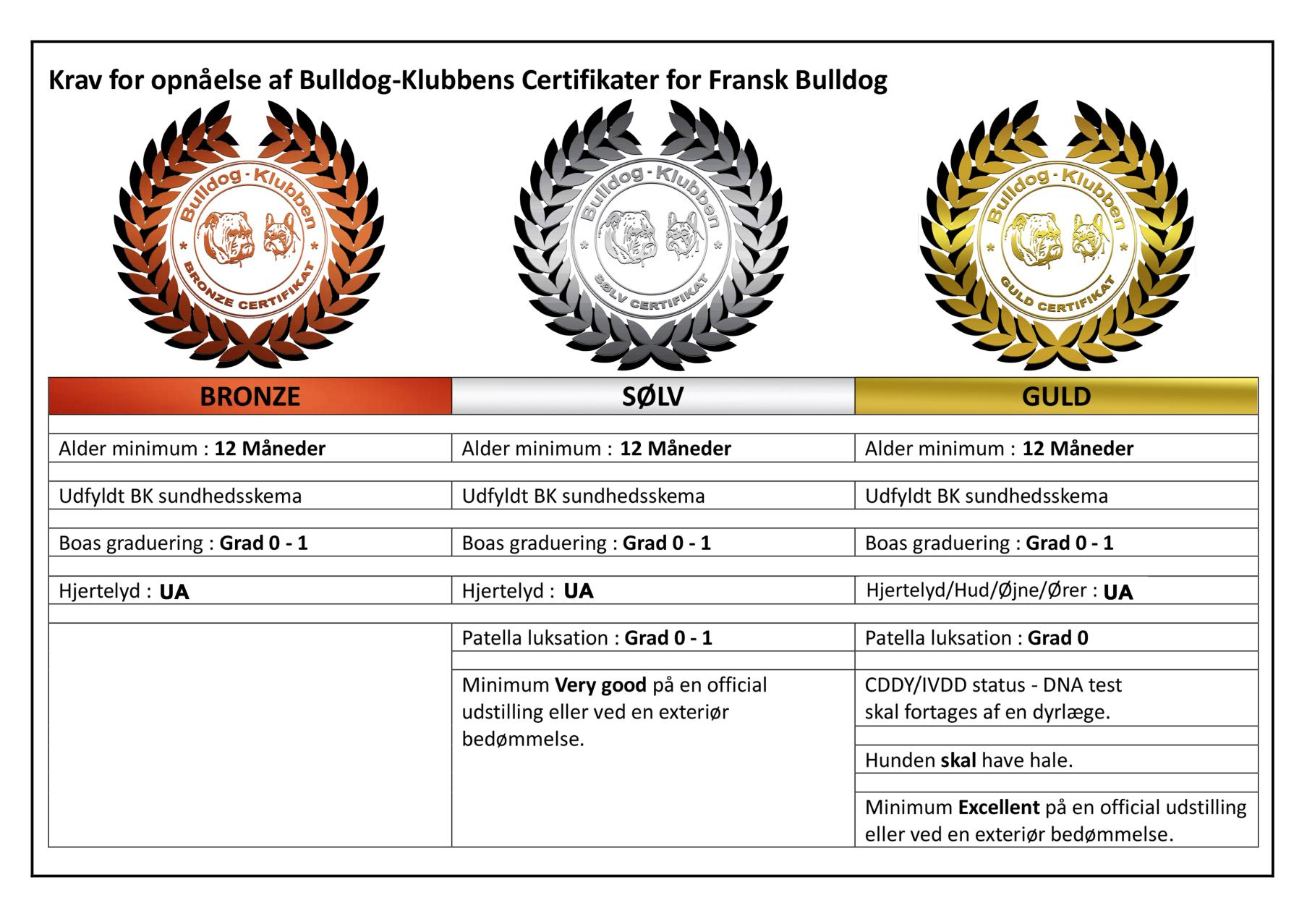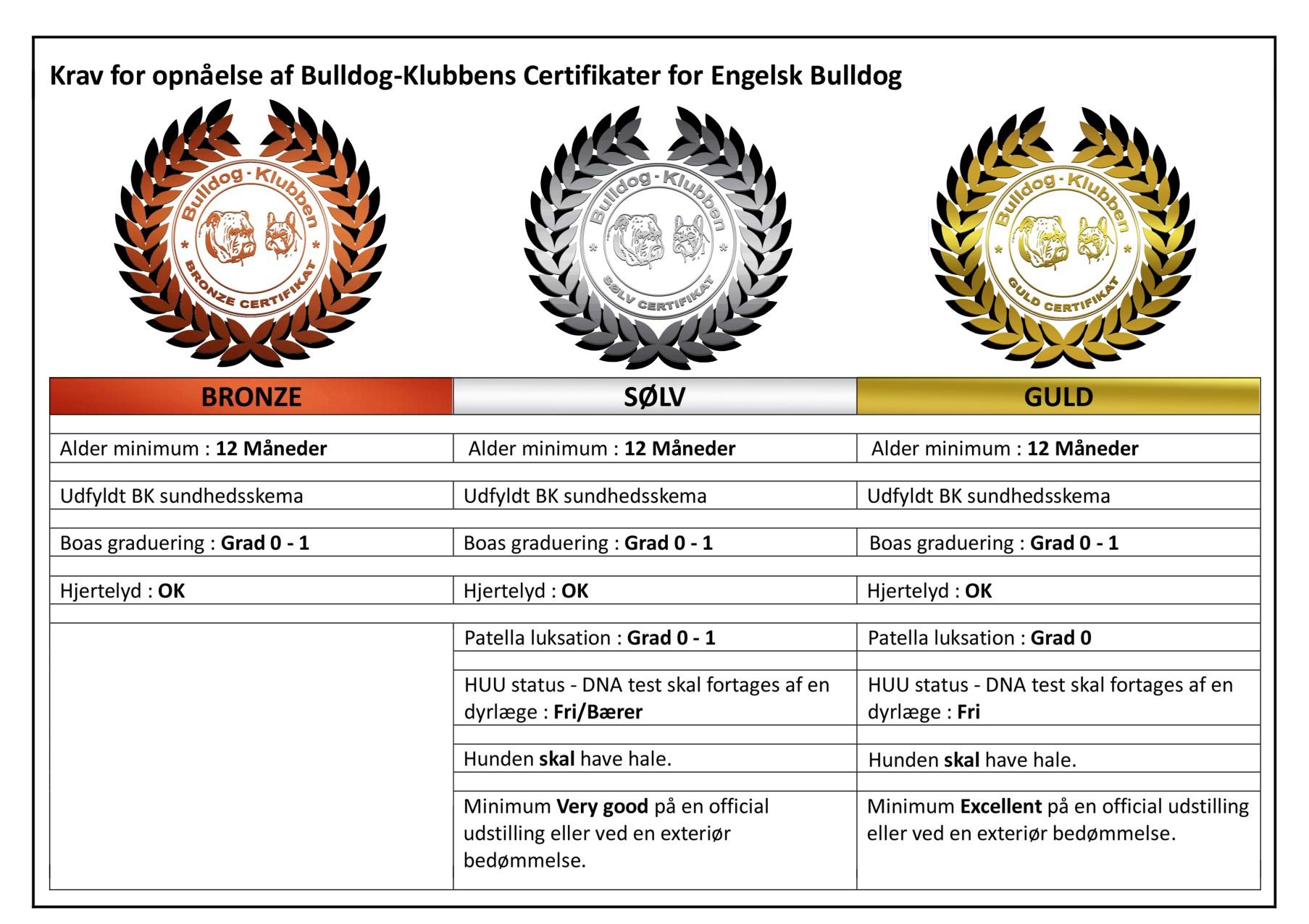 Bulldog-klubben tildeler alle hunde der deltager i sundhedsundersøgelserne og består de kriterier der er, forskellige niveauer af certifikater.
