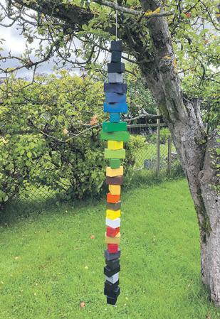 Såga profilen i korta längder mellan 7-12 cm. Såga ca 25 stycken bitar. Borra sedan ett centrerat hål i varje bit och slipa kanterna. För att träbitarna ska hålla längre kan det vara bra att olja in dem och låta det torka in innan man målar dem. Måla träbitarna i olika klulörer. Vi använde akrylfärg och blande till olika färgtoner. När bitarna torkat, trä upp dem på linan och häng i ett träd, på balkongen eller varför inte inomhus?