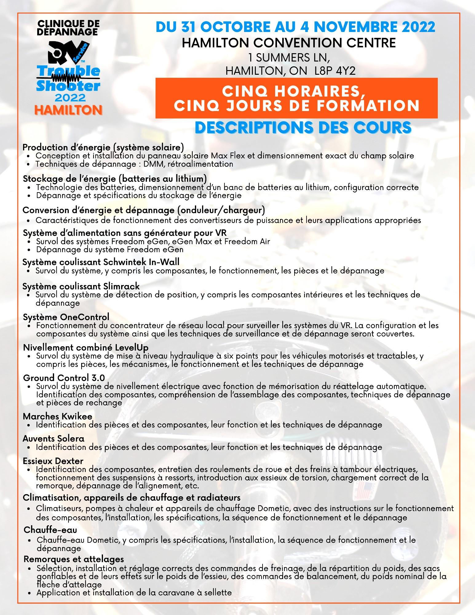 Le cours en ligne, élaboré par des spécialistes en gestion de l’entretien de l'industrie du VR, se divise en modules de formation qui portent sur divers sujets, notamment la gestion des rendez-vous et du flux de travaux, la génération de revenus additionnels et l’amélioration de la communication avec les clients. Le cours, interactif et facile à naviguer, est un moyen idéal de fournir une base de connaissance aux nouveaux employés ou servir de mise à jour aux professionnels chevronnés des opérations fixes. Les modules renforcent les compétences en service à la clientèle que doivent posséder les préposés à la clientèle/conseillers en service pour leurs activités quotidiennes. À la fin du cours, il y aura une vaste évaluation finale pour tester les connaissances et les compétences apprises dans le cours. Le cours constitue une excellente préparation au test de certification des préposés à la clientèle/conseillers en service du Centre d’apprentissage du VR, qui est distinct du programme de formation en ligne.