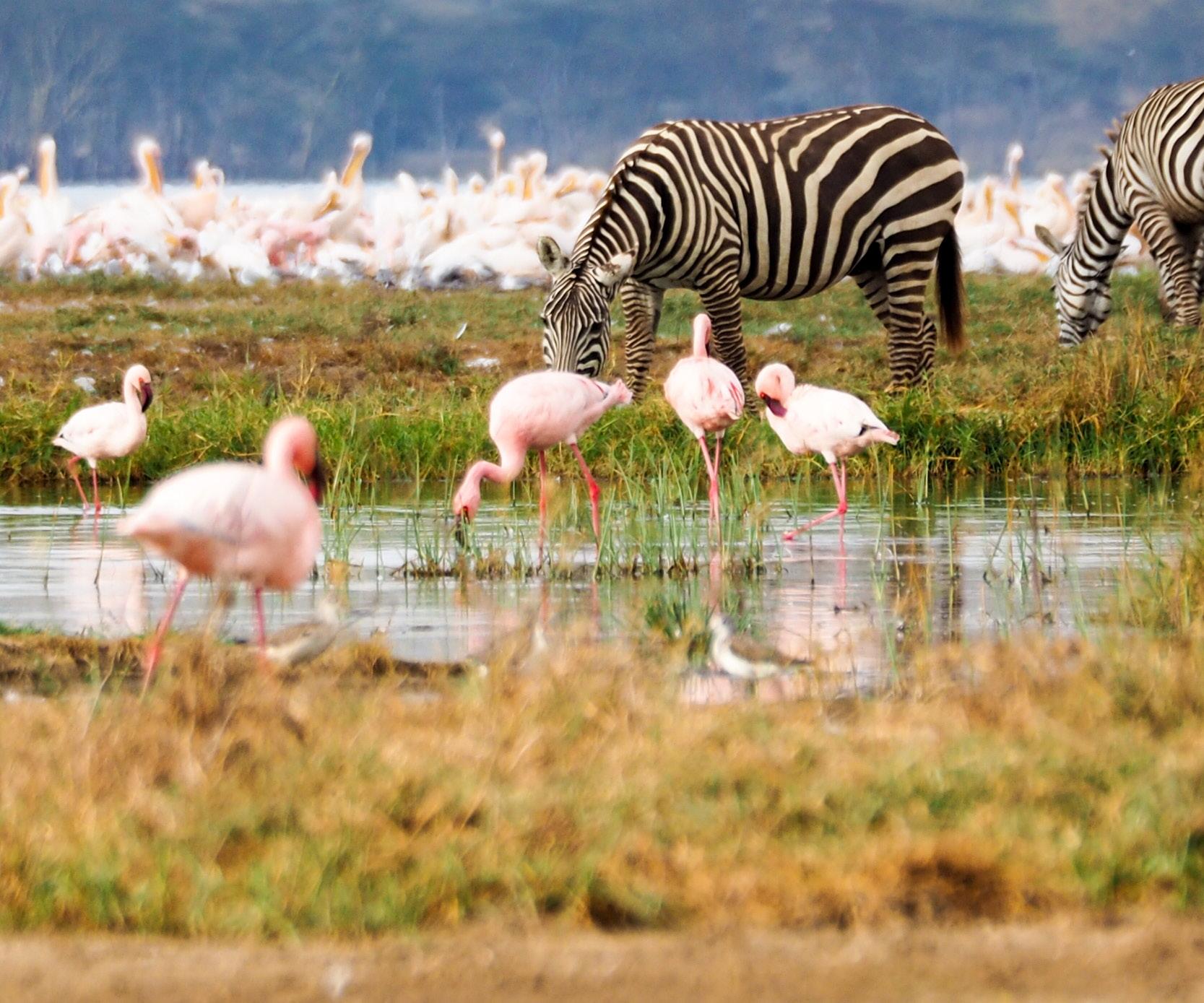 • Flamingos flock to the shallows of Kenya’s Lake Nakuru.