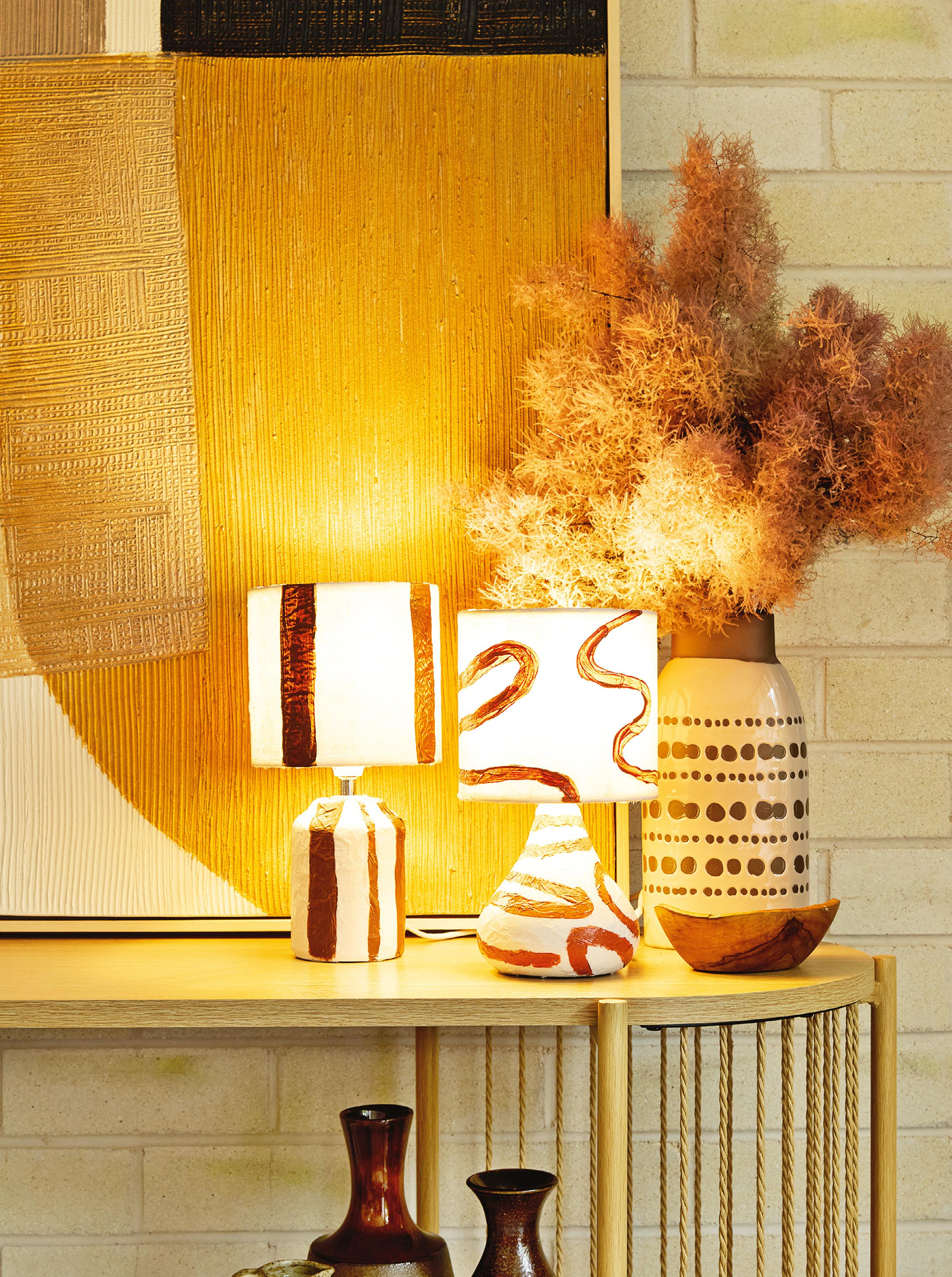● Brilliant ‘Ivy’ 50cm table lamp in Black and Brass, $118.87, I/N: 0465073 (globe sold separately). ● Flexi Storage ‘Decorative Shelving’ 1200mm floating photo shelves in Oak, $26 each, I/N: 0127435. ● Brilliant ‘Ivy’ 155cm floor lamp in Gold and Black, $128.98, I/N: 0465075 (globe sold separately). ● Zanzibar Gem in Northcote Pottery ‘Primo’ 28cm medium garden mod egg pot in Copper, $39.98, I/N: 2832609 (plant sold separately).
