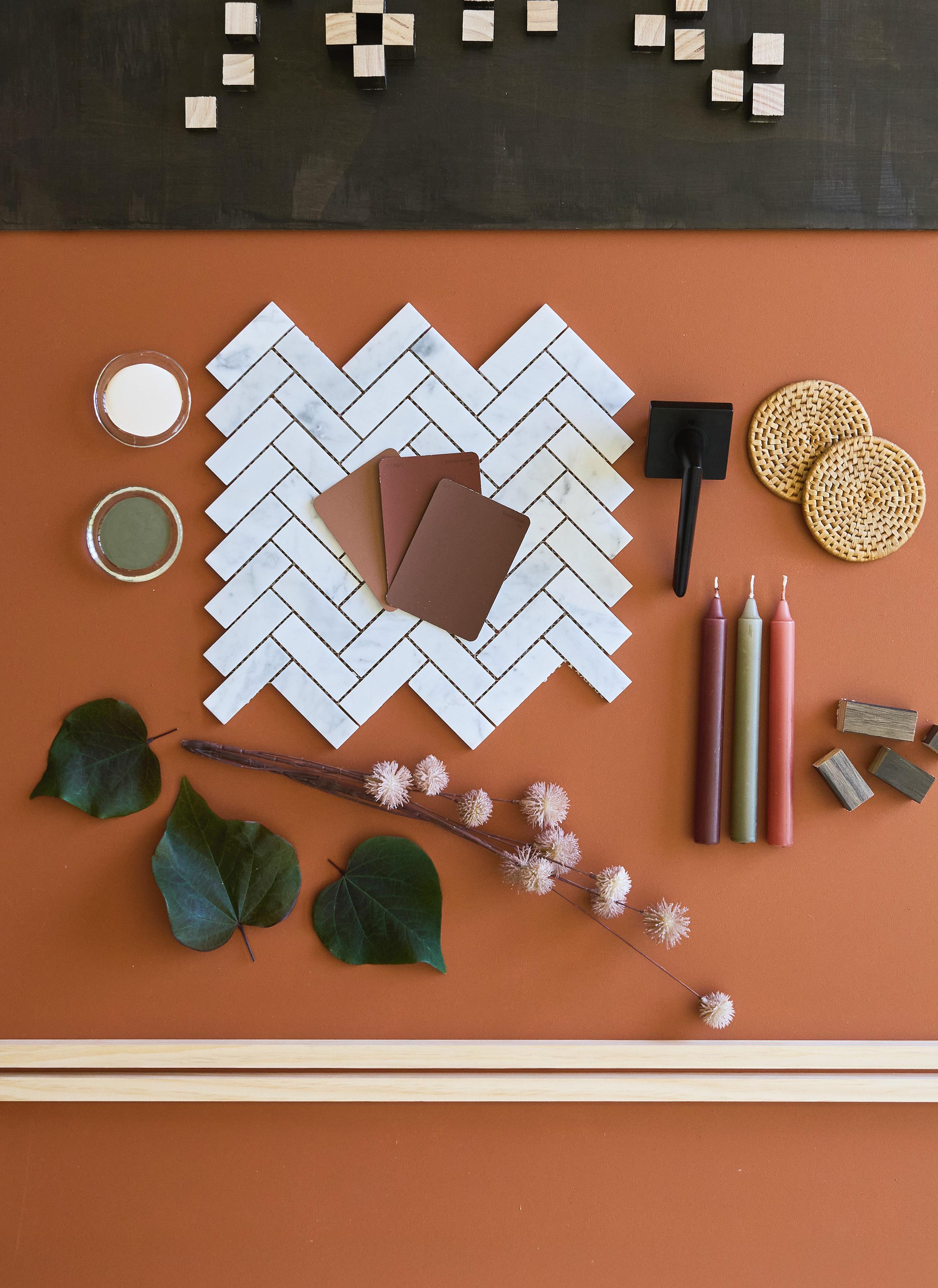 ● 1 DIY timber artwork, see page 80 for materials and instructions. ● 2 Background in British Paints Natural Paprika paint ● 3 Dulux Mt Aspiring