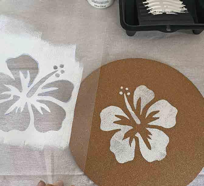 3 Working on a drop cloth, centre the stencil on a round cork mat, then apply a coat of paint to the design.
