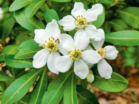 Also known as Choisya, this verdant shrub bears masses of white flowers in spring and summer with a citrusblossom scent. Plant in full sun to part shade in freedraining soil, and water slowly and frequently while the plant is establishing. The shrub has striking three-part leaves and can grow up to two metres. Trim after the first bloom of flowers to promote a second flush in autumn. ●
